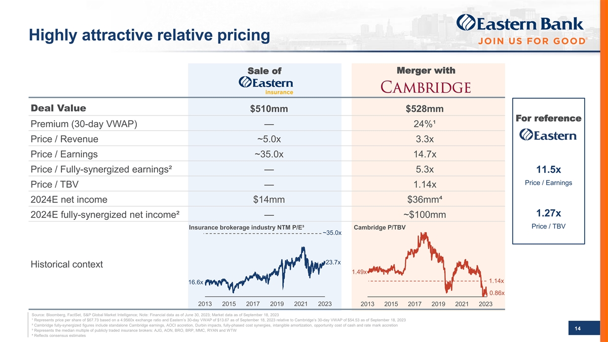 Summary of transaction terms Sale Merger of with ⚫ Transaction value of $528mm ⚫ Transaction value of $510mm ⚫ Consideration: 100% stock Consideration ⚫ Consideration: 100% cash and structure ⚫ Fixed exchange ratio: 4.9560x of EBC stock ⚫ TSA agreement in place through early 2024 ⚫ Pro forma ownership: 82% EBC / 18% CATC ⚫ Bob Rivers to become Executive Chair ⚫ Denis Sheahan to become CEO, reporting to Executive Chair Change in ⚫ Tim Lodge and 5 other EIG executives joining Gallagher management ⚫ Quincy Miller adding COO role, reporting to Executive Chair ⚫ ~415 EIG employees joining Gallagher and Board ⚫ Denis Sheahan and three other board members from CATC to join EBC Board ⚫ Hart-Scott-Rodino approval⚫ Customary bank regulatory approvals Approvals and anticipated ⚫ No EBC shareholder approval required⚫ EBC and CATC shareholder approval closing ⚫ Expected closing in the fourth quarter of 2023⚫ Expected closing in the first quarter of 2024 13 Source: FactSet; S&P Global Market Intelligence; Note: Market data as of September 18, 2023