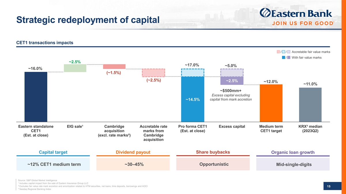 Highly attractive relative pricing Merger with Sale of Deal Value $510mm $528mm For reference Premium (30-day VWAP) — 24%¹ Price / Revenue ~5.0x 3.3x Price / Earnings ~35.0x 14.7x Price / Fully-synergized earnings² — 5.3x 11.5x Price / Earnings Price / TBV — 1.14x 2024E net income $14mm $36mm⁴ 1.27x 2024E fully-synergized net income² — ~$100mm Price / TBV Insurance brokerage industry NTM P/E³ Cambridge P/TBV ~35.0x 23.7x Historical context 1.49x 1.14x 16.6x 0.86x 2013 2015 2017 2019 2021 2023 2013 2015 2017 2019 2021 2023 Source: Bloomberg, FactSet, S&P Global Market Intelligence; Note: Financial data as of June 30, 2023; Market data as of September 18, 2023 ¹ Represents price per share of $67.73 based on a 4.9560x exchange ratio and Eastern’s 30-day VWAP of $13.67 as of September 18, 2023 relative to Cambridge’s 30-day VWAP of $54.53 as of September 18, 2023 ² Cambridge fully-synergized figures include standalone Cambridge earnings, AOCI accretion, Durbin impacts, fully-phased cost synergies, intangible amortization, opportunity cost of cash and rate mark accretion 14 ³ Represents the median multiple of publicly traded insurance brokers: AJG, AON, BRO, BRP, MMC, RYAN and WTW ⁴ Reflects consensus estimates