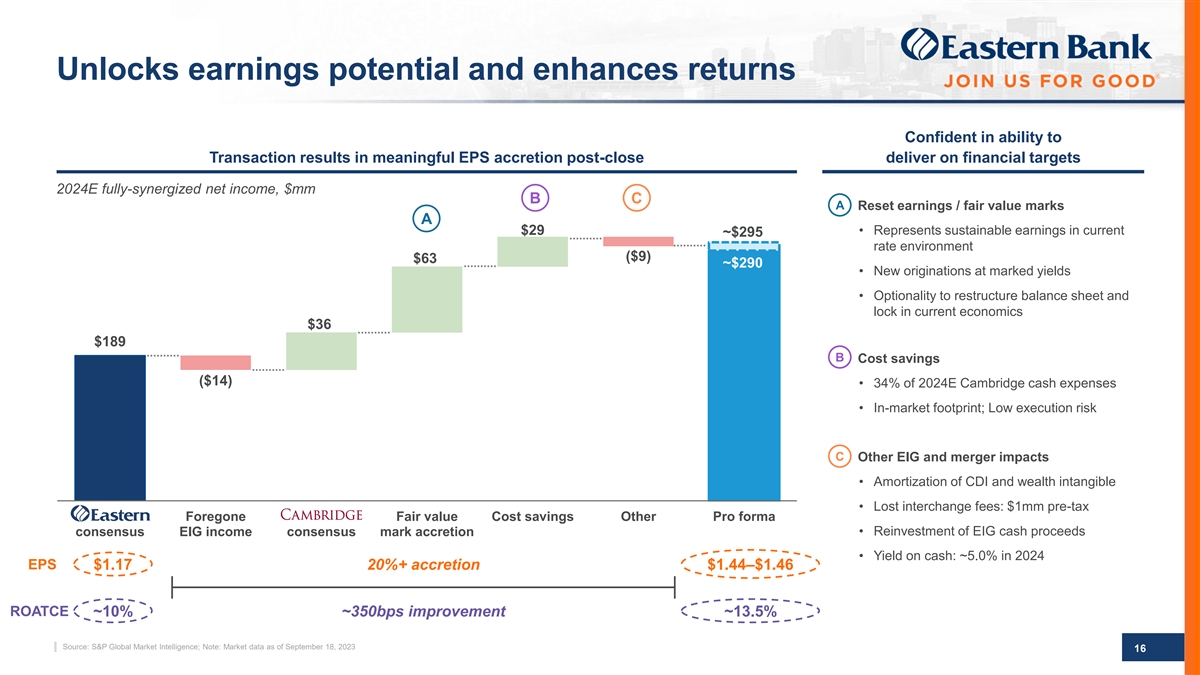 Strategic redeployment of capital CET1 transactions impacts / / Accretable fair value marks / With fair value marks ~2.5% ~17.0% ~5.0% ~16.0% (~1.5%) (~2.5%) ~2.5% ~12.0% ~11.0% ~$500mm+ Excess capital excluding capital from mark accretion ~14.5% Eastern standalone EIG sale¹ Cambridge Accretable rate Pro forma CET1 Excess capital Medium term KRX³ median CET1 acquisition marks from (Est. at close) CET1 target (2023Q2) (Est. at close) (excl. rate marks²) Cambridge acquisition Capital target Dividend payout Share buybacks Organic loan growth ~12% CET1 medium term ~30–45% Opportunistic Mid-single-digits Source: S&P Global Market Intelligence ¹ Includes capital impact from the sale of Eastern Insurance Group LLC ² Excludes fair value rate mark accretion and amortization related to HTM securities, net loans, time deposits, borrowings and AOCI 15 ³ Nasdaq Regional Banking Index