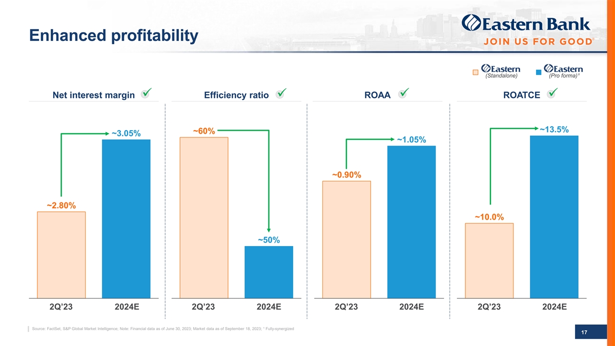 Unlocks earnings potential and enhances returns Confident in ability to Transaction results in meaningful EPS accretion post-close deliver on financial targets 2024E fully-synergized net income, $mm B C A • Reset earnings / fair value marks A $29 • Represents sustainable earnings in current ~$295 rate environment ($9) $63 ~$290 • New originations at marked yields • Optionality to restructure balance sheet and lock in current economics $36 $189 B • Cost savings ($14) • 34% of 2024E Cambridge cash expenses • In-market footprint; Low execution risk C• Other EIG and merger impacts • Amortization of CDI and wealth intangible • Lost interchange fees: $1mm pre-tax Foregone Fair value Cost savings Other Pro forma consensus EIG income consensus mark accretion • Reinvestment of EIG cash proceeds • Yield on cash: ~5.0% in 2024 EPS $1.17 20%+ accretion $1.44–$1.46 ROATCE ~10% ~350bps improvement ~13.5% Source: S&P Global Market Intelligence; Note: Market data as of September 18, 2023 16