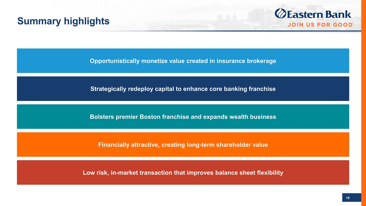 Summary highlights Opportunistically monetize value created in insurance brokerage Strategically redeploy capital to enhance core banking franchise Bolsters premier Boston franchise and expands wealth business Financially attractive, creating long-term shareholder value Low risk, in-market transaction that improves balance sheet flexibility 18