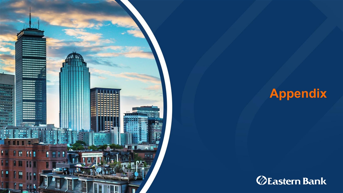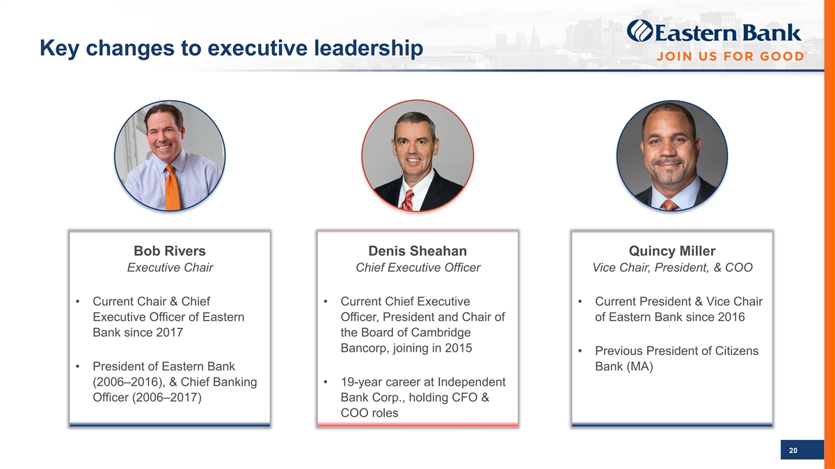Key changes to executive leadership Bob Rivers Denis Sheahan Quincy Miller Executive Chair Chief Executive Officer Vice Chair, President, & COO • Current Chair & Chief • Current Chief Executive • Current President & Vice Chair Executive Officer of Eastern Officer, President and Chair of of Eastern Bank since 2016 Bank since 2017 the Board of Cambridge Bancorp, joining in 2015 • Previous President of Citizens • President of Eastern Bank Bank (MA) (2006–2016), & Chief Banking • 19-year career at Independent Officer (2006–2017) Bank Corp., holding CFO & COO roles 20