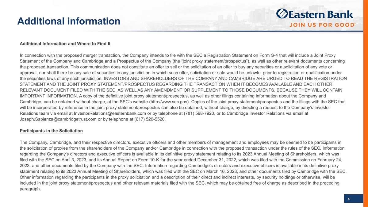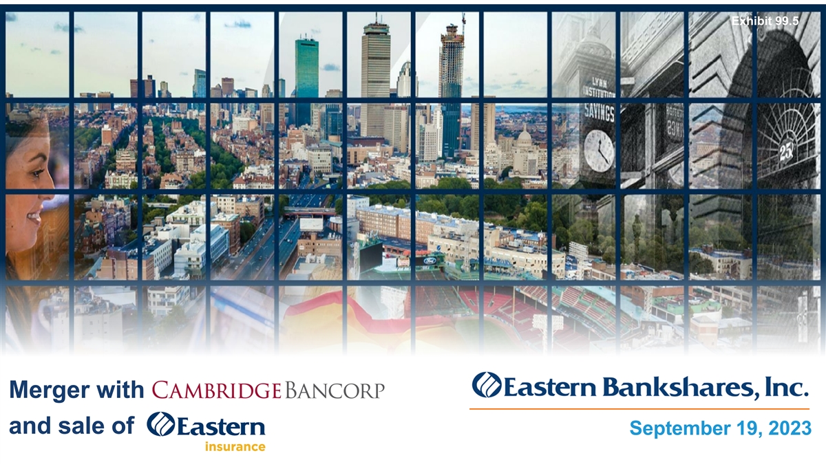Additional information Additional Information and Where to Find It In connection with the proposed merger transaction, the Company intends to file with the SEC a Registration Statement on Form S-4 that will include a Joint Proxy Statement of the Company and Cambridge and a Prospectus of the Company (the “joint proxy statement/prospectus”), as well as other relevant documents concerning the proposed transaction. This communication does not constitute an offer to sell or the solicitation of an offer to buy any securities or a solicitation of any vote or approval, nor shall there be any sale of securities in any jurisdiction in which such offer, solicitation or sale would be unlawful prior to registration or qualification under the securities laws of any such jurisdiction. INVESTORS AND SHAREHOLDERS OF THE COMPANY AND CAMBRIDGE ARE URGED TO READ THE REGISTRATION STATEMENT AND THE JOINT PROXY STATEMENT/PROSPECTUS REGARDING THE TRANSACTION WHEN IT BECOMES AVAILABLE AND EACH OTHER RELEVANT DOCUMENT FILED WITH THE SEC, AS WELL AS ANY AMENDMENT OR SUPPLEMENT TO THOSE DOCUMENTS, BECAUSE THEY WILL CONTAIN IMPORTANT INFORMATION. A copy of the definitive joint proxy statement/prospectus, as well as other filings containing information about the Company and Cambridge, can be obtained without charge, at the SEC’s website (http://www.sec.gov). Copies of the joint proxy statement/prospectus and the filings with the SEC that will be incorporated by reference in the joint proxy statement/prospectus can also be obtained, without charge, by directing a request to the Company’s Investor Relations team via email at InvestorRelations@easternbank.com or by telephone at (781) 598-7920, or to Cambridge Investor Relations via email at Joseph.Sapienza@cambridgetrust.com or by telephone at (617) 520-5520. Participants in the Solicitation The Company, Cambridge, and their respective directors, executive officers and other members of management and employees may be deemed to be participants in the solicitation of proxies from the shareholders of the Company and/or Cambridge in connection with the proposed transaction under the rules of the SEC. Information regarding the Company’s directors and executive officers is available in its definitive proxy statement relating to its 2023 Annual Meeting of Shareholders, which was filed with the SEC on April 3, 2023, and its Annual Report on Form 10-K for the year ended December 31, 2022, which was filed with the Commission on February 24, 2023, and other documents filed by the Company with the SEC. Information regarding Cambridge’s directors and executive officers is available in its definitive proxy statement relating to its 2023 Annual Meeting of Shareholders, which was filed with the SEC on March 16, 2023, and other documents filed by Cambridge with the SEC. Other information regarding the participants in the proxy solicitation and a description of their direct and indirect interests, by security holdings or otherwise, will be included in the joint proxy statement/prospectus and other relevant materials filed with the SEC, which may be obtained free of charge as described in the preceding paragraph. 4