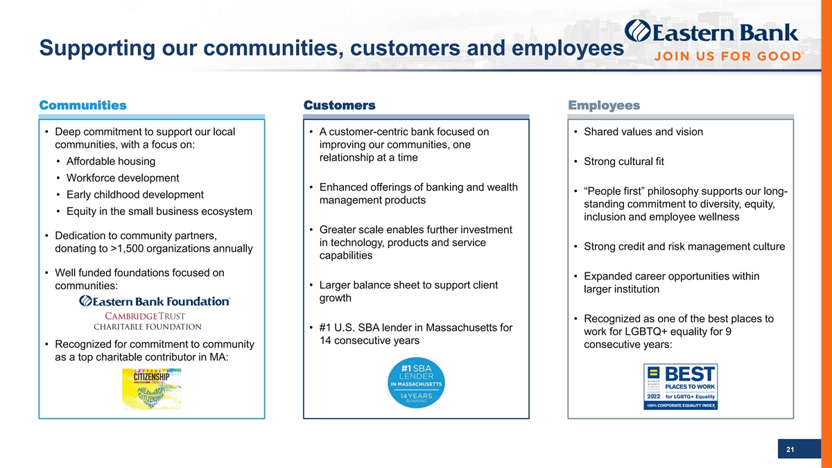 Supporting our communities, customers and employees Communities Customers Employees • Deep commitment to support our local • A customer-centric bank focused on • Shared values and vision communities, with a focus on: improving our communities, one relationship at a time • Affordable housing • Strong cultural fit • Workforce development • Enhanced offerings of banking and wealth • “People first” philosophy supports our long- • Early childhood development management products standing commitment to diversity, equity, • Equity in the small business ecosystem inclusion and employee wellness • Greater scale enables further investment • Dedication to community partners, in technology, products and service • Strong credit and risk management culture donating to >1,500 organizations annually capabilities • Well funded foundations focused on • Expanded career opportunities within • Larger balance sheet to support client communities: larger institution growth • Recognized as one of the best places to • #1 U.S. SBA lender in Massachusetts for work for LGBTQ+ equality for 9 14 consecutive years • Recognized for commitment to community consecutive years: as a top charitable contributor in MA: 21