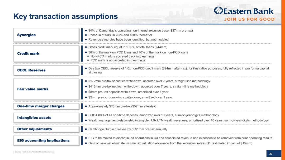 Key transaction assumptions ⚫ 34% of Cambridge’s operating non-interest expense base ($37mm pre-tax) Synergies⚫ Phase-in of 50% in 2024 and 100% thereafter ⚫ Revenue synergies have been identified, but not modeled ⚫ Gross credit mark equal to 1.09% of total loans ($44mm) ⚫ 30% of the mark on PCD loans and 70% of the mark on non-PCD loans Credit mark ⚫ Non-PCD mark is accreted back into earnings ⚫ PCD mark is not accreted into earnings ⚫ Day two CECL reserve of 1.0x non-PCD credit mark ($24mm after-tax); for illustrative purposes, fully reflected in pro forma capital CECL Reserves at closing ⚫ $172mm pre-tax securities write-down, accreted over 7 years, straight-line methodology ⚫ $413mm pre-tax net loan write-down, accreted over 7 years, straight-line methodology Fair value marks ⚫ $8mm pre-tax deposits write-down, amortized over 1 year $2mm pre-tax borrowings write-down, amortized over 1 year ⚫ One-time merger charges⚫ Approximately $70mm pre-tax ($57mm after-tax) ⚫ CDI: 4.00% of all non-time deposits, amortized over 10 years, sum-of-year-digits methodology Intangibles assets ⚫ Wealth management relationship intangible: 1.0x LTM wealth revenues, amortized over 10 years, sum-of-year-digits methodology Other adjustments⚫ Cambridge Durbin dis-synergy of $1mm pre-tax annually ⚫ EIG to be moved to discontinued operations in Q3 and associated revenue and expenses to be removed from prior operating results EIG accounting implications ⚫ Gain on sale will eliminate income tax valuation allowance from the securities sale in Q1 (estimated impact of $15mm) Source: FactSet; S&P Global Market Intelligence 22