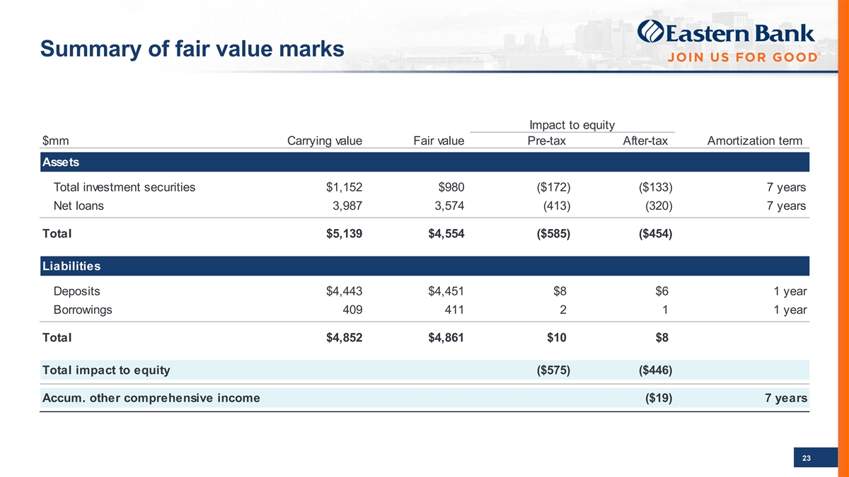 Summary of fair value marks Impact to equity $mm Carrying value Fair value Pre-tax After-tax Amortization term Assets Total investment securities $1,152 $980 ($172) ($133) 7 years Net loans 3,987 3,574 (413) (320) 7 years Total $5,139 $4,554 ($585) ($454) Liabilities Deposits $4,443 $4,451 $8 $6 1 year Borrowings 409 411 2 1 1 year Total $4,852 $4,861 $10 $8 Total impact to equity ($575) ($446) Accum. other comprehensive income ($19) 7 years 23