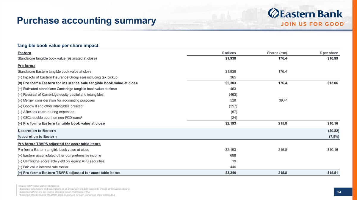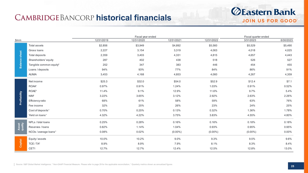 Purchase accounting summary Tangible book value per share impact Eastern $ millions Shares (mm) $ per share Standalone tangible book value (estimated at close) $1,938 176.4 $10.99 Pro forma Standalone Eastern tangible book value at close $1,938 176.4 (+) Impacts of Eastern Insurance Group sale including tax pickup 365 (=) Pro forma Eastern for insurance sale tangible book value at close $2,303 176.4 $13.06 (+) Estimated standalone Cambridge tangible book value at close 463 (–) Reversal of Cambridge equity capital and intangibles (463) (+) Merger consideration for accounting purposes 528 39.4³ (–) Goodw ill and other intangibles created¹ (557) (–) After-tax restructuring expenses (57) (–) CECL double count on non-PCD loans² (24) (=) Pro forma Eastern tangible book value at close $2,193 215.8 $10.16 $ accretion to Eastern ($0.82) % accretion to Eastern (7.5%) Pro forma TBVPS adjusted for accretable items Pro forma Eastern tangible book value at close $2,193 215.8 $10.16 (+) Eastern accumulated other comprehensive income 688 (+) Cambridge accretable yield on legacy AFS securities 19 (+) Fair value interest rate marks 446 (=) Pro forma Eastern TBVPS adjusted for accretable items $3,346 215.8 $15.51 Source: S&P Global Market Intelligence ¹ Based on expectations and assumptions as of announcement date; subject to change at transaction closing ² Based on $31mm pre-tax reserve allocated to non-PCD loans (70%) 24 ³ Based on 4.9560x shares of Eastern stock exchanged for each Cambridge share outstanding