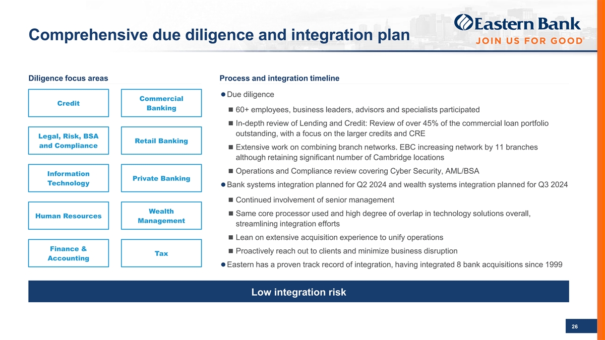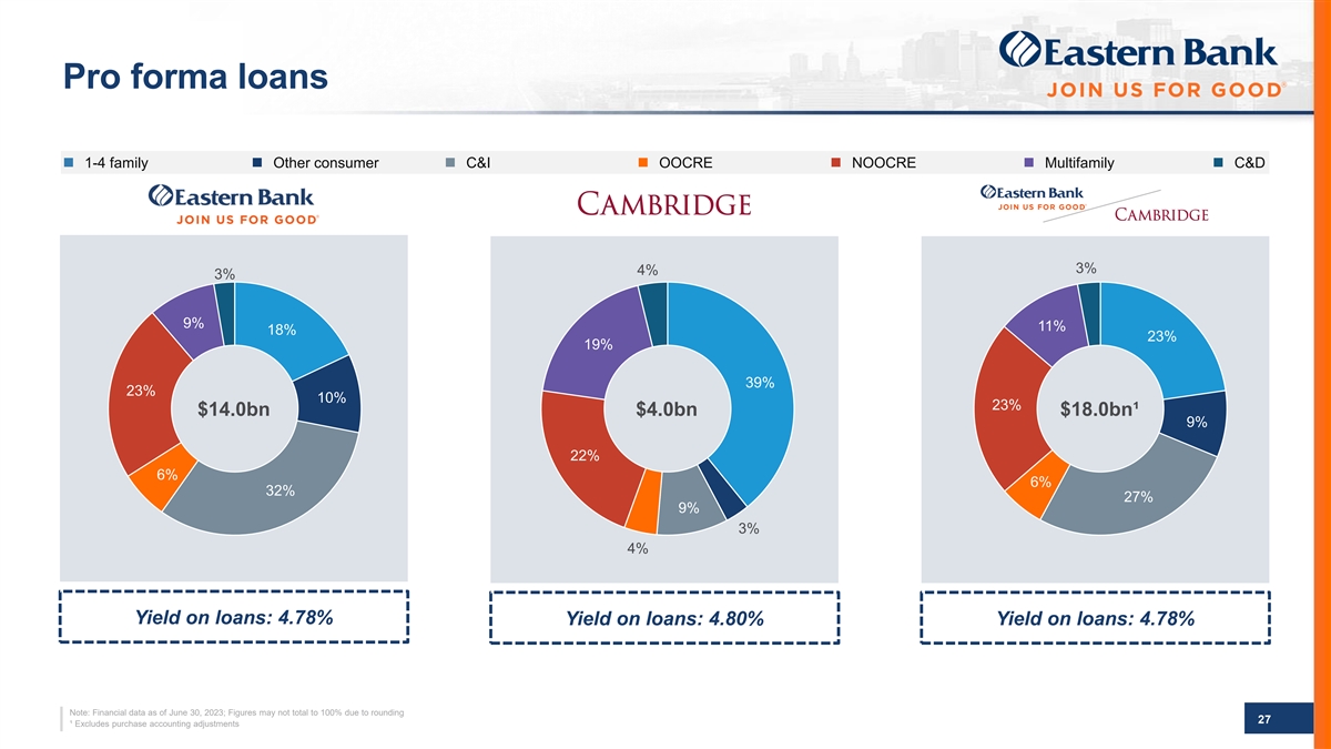 Comprehensive due diligence and integration plan Diligence focus areas Process and integration timeline ⚫Due diligence Commercial Credit Banking ◼ 60+ employees, business leaders, advisors and specialists participated ◼ In-depth review of Lending and Credit: Review of over 45% of the commercial loan portfolio outstanding, with a focus on the larger credits and CRE Legal, Risk, BSA Retail Banking and Compliance ◼ Extensive work on combining branch networks. EBC increasing network by 11 branches although retaining significant number of Cambridge locations ◼ Operations and Compliance review covering Cyber Security, AML/BSA Information Private Banking Technology ⚫Bank systems integration planned for Q2 2024 and wealth systems integration planned for Q3 2024 ◼ Continued involvement of senior management Wealth ◼ Same core processor used and high degree of overlap in technology solutions overall, Human Resources Management streamlining integration efforts ◼ Lean on extensive acquisition experience to unify operations Finance & ◼ Proactively reach out to clients and minimize business disruption Tax Accounting ⚫Eastern has a proven track record of integration, having integrated 8 bank acquisitions since 1999 Low integration risk 26