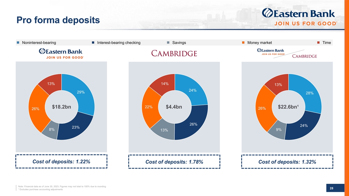 Pro forma loans 1-4 family Other consumer C&I OOCRE NOOCRE Multifamily C&D 3% 4% 3% 9% 11% 18% 23% 19% 39% 23% 10% 23% $14.0bn $4.0bn $18.0bn¹ 9% 22% 6% 6% 32% 27% 9% 3% 4% Yield on loans: 4.78% Yield on loans: 4.80% Yield on loans: 4.78% Note: Financial data as of June 30, 2023; Figures may not total to 100% due to rounding 27 ¹ Excludes purchase accounting adjustments