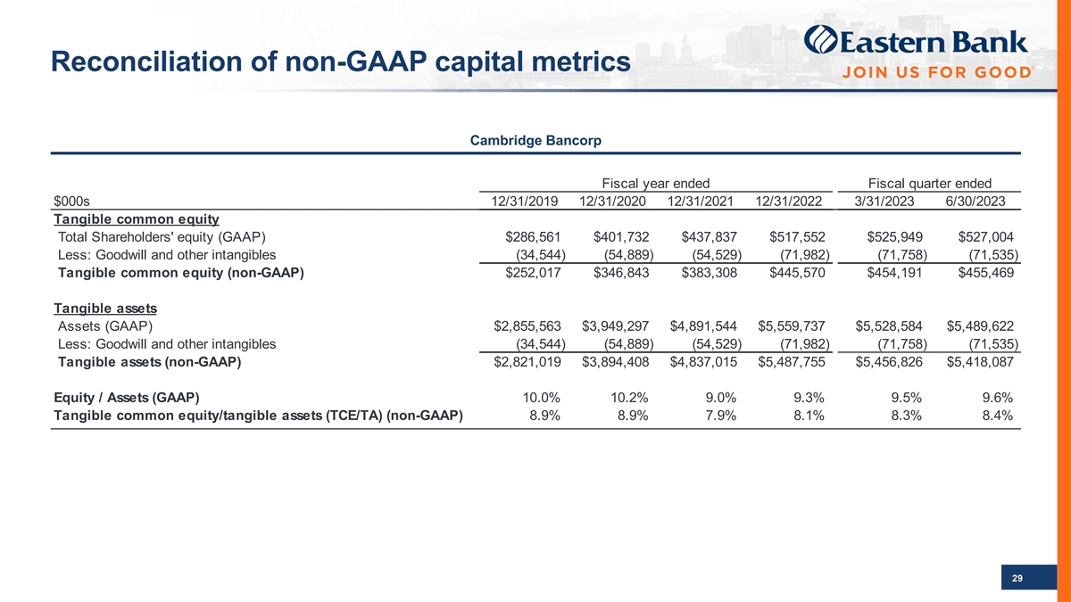 Reconciliation of non-GAAP capital metrics Cambridge Bancorp Fiscal year ended Fiscal quarter ended $000s 12/31/2019 12/31/2020 12/31/2021 12/31/2022 3/31/2023 6/30/2023 Tangible common equity Total Shareholders' equity (GAAP) $286,561 $401,732 $437,837 $517,552 $525,949 $527,004 Less: Goodwill and other intangibles (34,544) (54,889) (54,529) (71,982) (71,758) (71,535) Tangible common equity (non-GAAP) $252,017 $346,843 $383,308 $445,570 $454,191 $455,469 Tangible assets Assets (GAAP) $2,855,563 $3,949,297 $4,891,544 $5,559,737 $5,528,584 $5,489,622 Less: Goodwill and other intangibles (34,544) (54,889) (54,529) (71,982) (71,758) (71,535) Tangible assets (non-GAAP) $2,821,019 $3,894,408 $4,837,015 $5,487,755 $5,456,826 $5,418,087 Equity / Assets (GAAP) 10.0% 10.2% 9.0% 9.3% 9.5% 9.6% Tangible common equity/tangible assets (TCE/TA) (non-GAAP) 8.9% 8.9% 7.9% 8.1% 8.3% 8.4% 29