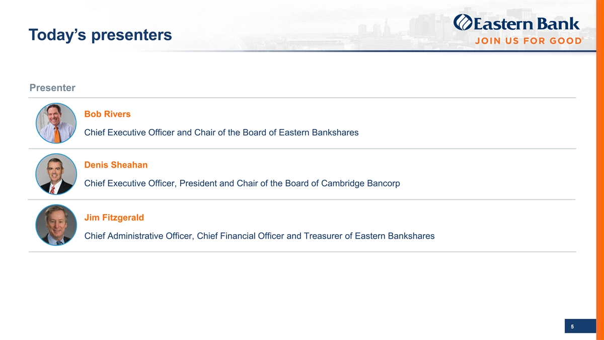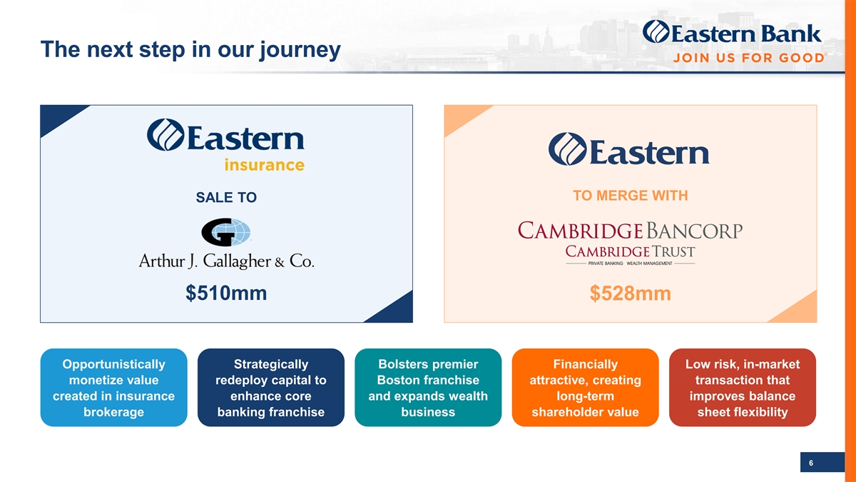 Today’s presenters Presenter Bob Rivers Chief Executive Officer and Chair of the Board of Eastern Bankshares Denis Sheahan Chief Executive Officer, President and Chair of the Board of Cambridge Bancorp Jim Fitzgerald Chief Administrative Officer, Chief Financial Officer and Treasurer of Eastern Bankshares 5
