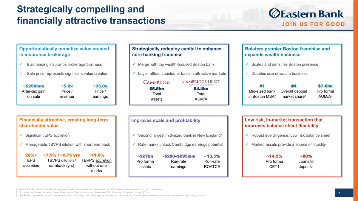 The next step in our journey TO MERGE WITH SALE TO $510mm $528mm Opportunistically Strategically Bolsters premier Financially Low risk, in-market monetize value redeploy capital to Boston franchise attractive, creating transaction that created in insurance enhance core and expands wealth long-term improves balance brokerage banking franchise business shareholder value sheet flexibility 6
