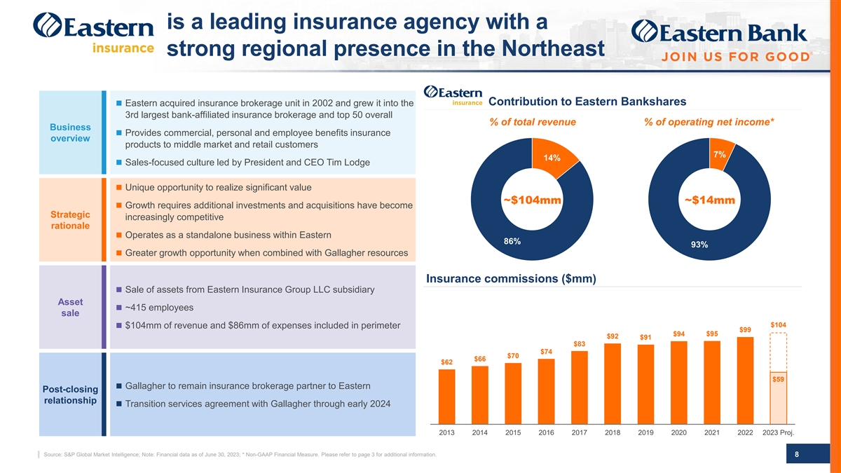 Strategically compelling and financially attractive transactions Opportunistically monetize value created Strategically redeploy capital to enhance Bolsters premier Boston franchise and in insurance brokerage core banking franchise expands wealth business ✓ Built leading insurance brokerage business✓ Merge with top wealth-focused Boston bank✓ Scales and densifies Boston presence ✓ Sale price represents significant value creation✓ Loyal, affluent customer base in attractive markets✓ Doubles size of wealth business ~$260mm ~5.0x ~35.0x #1 #4 $7.6bn $5.5bn $4.4bn After-tax gain Price / Price / Mid-sized bank Overall deposit Pro forma Total Total on sale revenue earnings in Boston MSA¹ market share¹ AUM/A² assets AUM/A Financially attractive, creating long-term Low risk, in-market transaction that Improves scale and profitability shareholder value improves balance sheet flexibility ✓ Significant EPS accretion✓ Second largest mid-sized bank in New England¹✓ Robust due diligence; Low risk balance sheet ✓ Manageable TBVPS dilution with short earnback✓ Rate marks unlock Cambridge earnings potential✓ Marked assets provide a source of liquidity 20%+ ~7.5% / ~2.75 yrs ~11.0% ~$27bn ~$290–$295mm ~13.5% ~14.5% ~80% EPS TBVPS dilution / TBVPS accretion Pro forma Run-rate Run-rate Pro forma Loans to accretion earnback (yrs) without rate assets earnings ROATCE CET1 deposits marks Source: FactSet, S&P Global Market Intelligence; Note: Market data as of September 18, 2023; Metrics reflect returns from both transactions ¹ Excludes trust banks; Mid-sized bank defined as <$100bn in total assets; Based on FDIC Summary of Deposits Survey (2022) 7 ² For Eastern represents assets under supervision in a fiduciary, custodial or agency capacity for customers; For Cambridge represents assets under management and custody assets