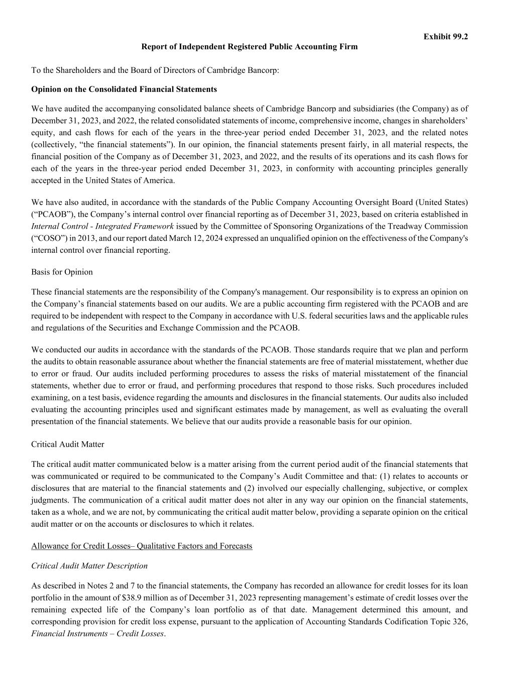 Exhibit 99.2 Report of Independent Registered Public Accounting Firm To the Shareholders and the Board of Directors of Cambridge Bancorp: Opinion on the Consolidated Financial Statements We have audited the accompanying consolidated balance sheets of Cambridge Bancorp and subsidiaries (the Company) as of December 31, 2023, and 2022, the related consolidated statements of income, comprehensive income, changes in shareholders’ equity, and cash flows for each of the years in the three-year period ended December 31, 2023, and the related notes (collectively, “the financial statements”). In our opinion, the financial statements present fairly, in all material respects, the financial position of the Company as of December 31, 2023, and 2022, and the results of its operations and its cash flows for each of the years in the three-year period ended December 31, 2023, in conformity with accounting principles generally accepted in the United States of America. We have also audited, in accordance with the standards of the Public Company Accounting Oversight Board (United States) (“PCAOB”), the Company’s internal control over financial reporting as of December 31, 2023, based on criteria established in Internal Control - Integrated Framework issued by the Committee of Sponsoring Organizations of the Treadway Commission (“COSO”) in 2013, and our report dated March 12, 2024 expressed an unqualified opinion on the effectiveness of the Company's internal control over financial reporting. Basis for Opinion These financial statements are the responsibility of the Company's management. Our responsibility is to express an opinion on the Company’s financial statements based on our audits. We are a public accounting firm registered with the PCAOB and are required to be independent with respect to the Company in accordance with U.S. federal securities laws and the applicable rules and regulations of the Securities and Exchange Commission and the PCAOB. We conducted our audits in accordance with the standards of the PCAOB. Those standards require that we plan and perform the audits to obtain reasonable assurance about whether the financial statements are free of material misstatement, whether due to error or fraud. Our audits included performing procedures to assess the risks of material misstatement of the financial statements, whether due to error or fraud, and performing procedures that respond to those risks. Such procedures included examining, on a test basis, evidence regarding the amounts and disclosures in the financial statements. Our audits also included evaluating the accounting principles used and significant estimates made by management, as well as evaluating the overall presentation of the financial statements. We believe that our audits provide a reasonable basis for our opinion. Critical Audit Matter The critical audit matter communicated below is a matter arising from the current period audit of the financial statements that was communicated or required to be communicated to the Company’s Audit Committee and that: (1) relates to accounts or disclosures that are material to the financial statements and (2) involved our especially challenging, subjective, or complex judgments. The communication of a critical audit matter does not alter in any way our opinion on the financial statements, taken as a whole, and we are not, by communicating the critical audit matter below, providing a separate opinion on the critical audit matter or on the accounts or disclosures to which it relates. Allowance for Credit Losses– Qualitative Factors and Forecasts Critical Audit Matter Description As described in Notes 2 and 7 to the financial statements, the Company has recorded an allowance for credit losses for its loan portfolio in the amount of $38.9 million as of December 31, 2023 representing management’s estimate of credit losses over the remaining expected life of the Company’s loan portfolio as of that date. Management determined this amount, and corresponding provision for credit loss expense, pursuant to the application of Accounting Standards Codification Topic 326, Financial Instruments – Credit Losses.