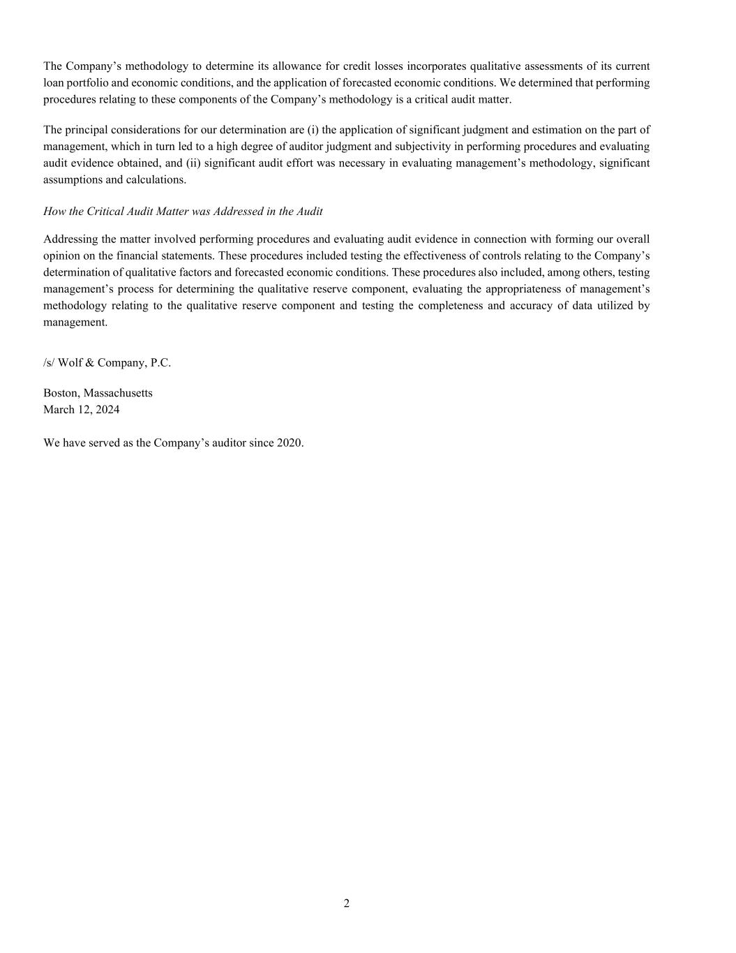 2 The Company’s methodology to determine its allowance for credit losses incorporates qualitative assessments of its current loan portfolio and economic conditions, and the application of forecasted economic conditions. We determined that performing procedures relating to these components of the Company’s methodology is a critical audit matter. The principal considerations for our determination are (i) the application of significant judgment and estimation on the part of management, which in turn led to a high degree of auditor judgment and subjectivity in performing procedures and evaluating audit evidence obtained, and (ii) significant audit effort was necessary in evaluating management’s methodology, significant assumptions and calculations. How the Critical Audit Matter was Addressed in the Audit Addressing the matter involved performing procedures and evaluating audit evidence in connection with forming our overall opinion on the financial statements. These procedures included testing the effectiveness of controls relating to the Company’s determination of qualitative factors and forecasted economic conditions. These procedures also included, among others, testing management’s process for determining the qualitative reserve component, evaluating the appropriateness of management’s methodology relating to the qualitative reserve component and testing the completeness and accuracy of data utilized by management. /s/ Wolf & Company, P.C. Boston, Massachusetts March 12, 2024 We have served as the Company’s auditor since 2020.