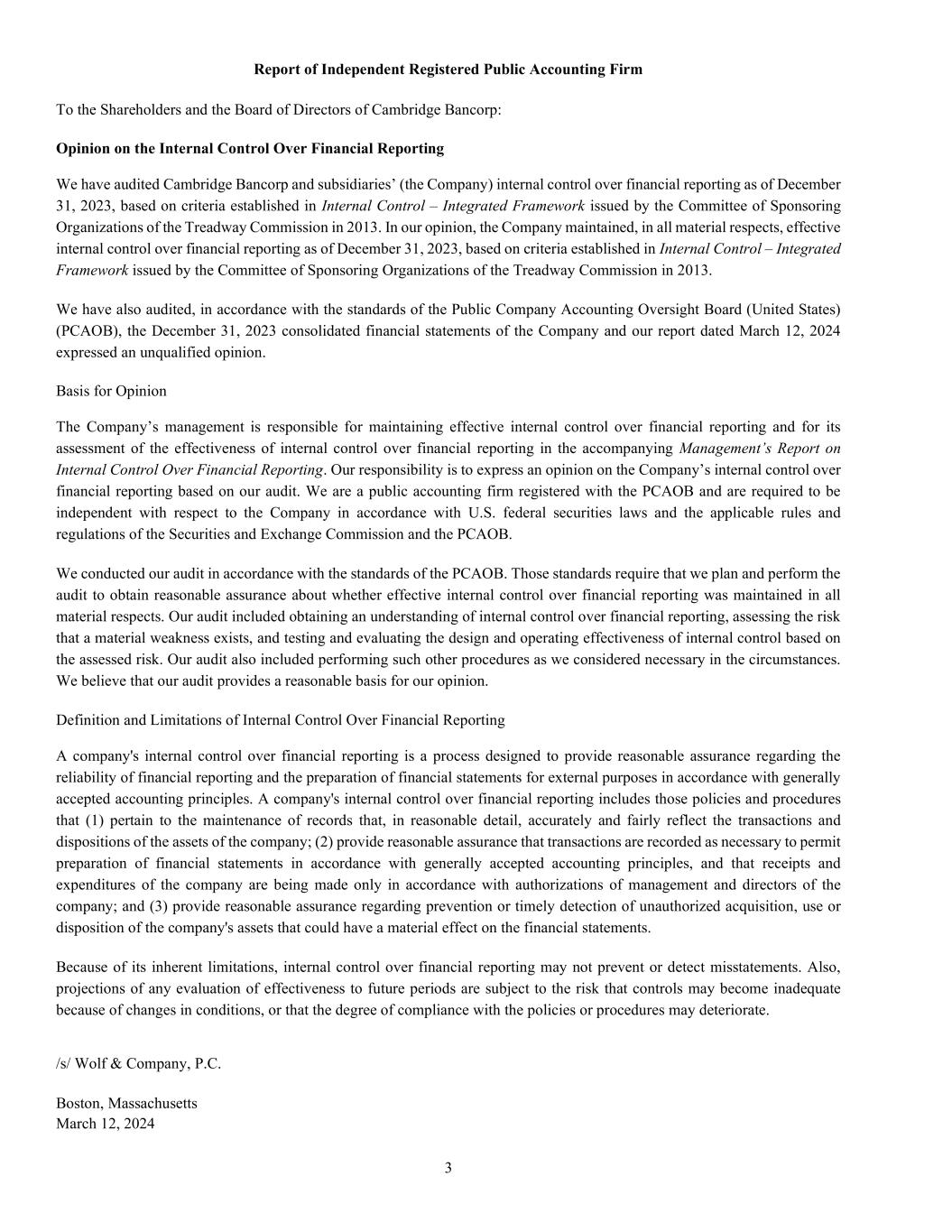 3 Report of Independent Registered Public Accounting Firm To the Shareholders and the Board of Directors of Cambridge Bancorp: Opinion on the Internal Control Over Financial Reporting We have audited Cambridge Bancorp and subsidiaries’ (the Company) internal control over financial reporting as of December 31, 2023, based on criteria established in Internal Control – Integrated Framework issued by the Committee of Sponsoring Organizations of the Treadway Commission in 2013. In our opinion, the Company maintained, in all material respects, effective internal control over financial reporting as of December 31, 2023, based on criteria established in Internal Control – Integrated Framework issued by the Committee of Sponsoring Organizations of the Treadway Commission in 2013. We have also audited, in accordance with the standards of the Public Company Accounting Oversight Board (United States) (PCAOB), the December 31, 2023 consolidated financial statements of the Company and our report dated March 12, 2024 expressed an unqualified opinion. Basis for Opinion The Company’s management is responsible for maintaining effective internal control over financial reporting and for its assessment of the effectiveness of internal control over financial reporting in the accompanying Management’s Report on Internal Control Over Financial Reporting. Our responsibility is to express an opinion on the Company’s internal control over financial reporting based on our audit. We are a public accounting firm registered with the PCAOB and are required to be independent with respect to the Company in accordance with U.S. federal securities laws and the applicable rules and regulations of the Securities and Exchange Commission and the PCAOB. We conducted our audit in accordance with the standards of the PCAOB. Those standards require that we plan and perform the audit to obtain reasonable assurance about whether effective internal control over financial reporting was maintained in all material respects. Our audit included obtaining an understanding of internal control over financial reporting, assessing the risk that a material weakness exists, and testing and evaluating the design and operating effectiveness of internal control based on the assessed risk. Our audit also included performing such other procedures as we considered necessary in the circumstances. We believe that our audit provides a reasonable basis for our opinion. Definition and Limitations of Internal Control Over Financial Reporting A company's internal control over financial reporting is a process designed to provide reasonable assurance regarding the reliability of financial reporting and the preparation of financial statements for external purposes in accordance with generally accepted accounting principles. A company's internal control over financial reporting includes those policies and procedures that (1) pertain to the maintenance of records that, in reasonable detail, accurately and fairly reflect the transactions and dispositions of the assets of the company; (2) provide reasonable assurance that transactions are recorded as necessary to permit preparation of financial statements in accordance with generally accepted accounting principles, and that receipts and expenditures of the company are being made only in accordance with authorizations of management and directors of the company; and (3) provide reasonable assurance regarding prevention or timely detection of unauthorized acquisition, use or disposition of the company's assets that could have a material effect on the financial statements. Because of its inherent limitations, internal control over financial reporting may not prevent or detect misstatements. Also, projections of any evaluation of effectiveness to future periods are subject to the risk that controls may become inadequate because of changes in conditions, or that the degree of compliance with the policies or procedures may deteriorate. /s/ Wolf & Company, P.C. Boston, Massachusetts March 12, 2024