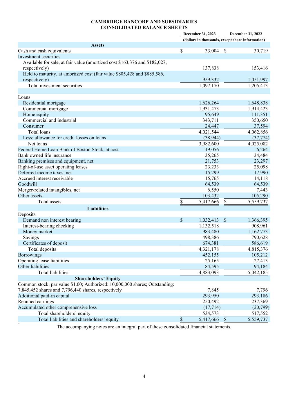 4 CAMBRIDGE BANCORP AND SUBSIDIARIES CONSOLIDATED BALANCE SHEETS December 31, 2023 December 31, 2022 (dollars in thousands, except share information) Assets Cash and cash equivalents $ 33,004 $ 30,719 Investment securities Available for sale, at fair value (amortized cost $163,376 and $182,027, respectively) 137,838 153,416 Held to maturity, at amortized cost (fair value $805,428 and $885,586, respectively) 959,332 1,051,997 Total investment securities 1,097,170 1,205,413 Loans Residential mortgage 1,626,264 1,648,838 Commercial mortgage 1,931,473 1,914,423 Home equity 95,649 111,351 Commercial and industrial 343,711 350,650 Consumer 24,447 37,594 Total loans 4,021,544 4,062,856 Less: allowance for credit losses on loans (38,944 ) (37,774) Net loans 3,982,600 4,025,082 Federal Home Loan Bank of Boston Stock, at cost 19,056 6,264 Bank owned life insurance 35,265 34,484 Banking premises and equipment, net 21,753 23,297 Right-of-use asset operating leases 23,233 25,098 Deferred income taxes, net 15,299 17,990 Accrued interest receivable 15,765 14,118 Goodwill 64,539 64,539 Merger-related intangibles, net 6,550 7,443 Other assets 103,432 105,290 Total assets $ 5,417,666 $ 5,559,737 Liabilities Deposits Demand non interest bearing $ 1,032,413 $ 1,366,395 Interest-bearing checking 1,132,518 908,961 Money market 983,480 1,162,773 Savings 498,386 790,628 Certificates of deposit 674,381 586,619 Total deposits 4,321,178 4,815,376 Borrowings 452,155 105,212 Operating lease liabilities 25,165 27,413 Other liabilities 84,595 94,184 Total liabilities 4,883,093 5,042,185 Shareholders’ Equity Common stock, par value $1.00; Authorized: 10,000,000 shares; Outstanding: 7,845,452 shares and 7,796,440 shares, respectively 7,845 7,796 Additional paid-in capital 293,950 293,186 Retained earnings 250,492 237,369 Accumulated other comprehensive loss (17,714 ) (20,799) Total shareholders’ equity 534,573 517,552 Total liabilities and shareholders’ equity $ 5,417,666 $ 5,559,737 Auditor The accompanying notes are an integral part of these consolidated financial statements.