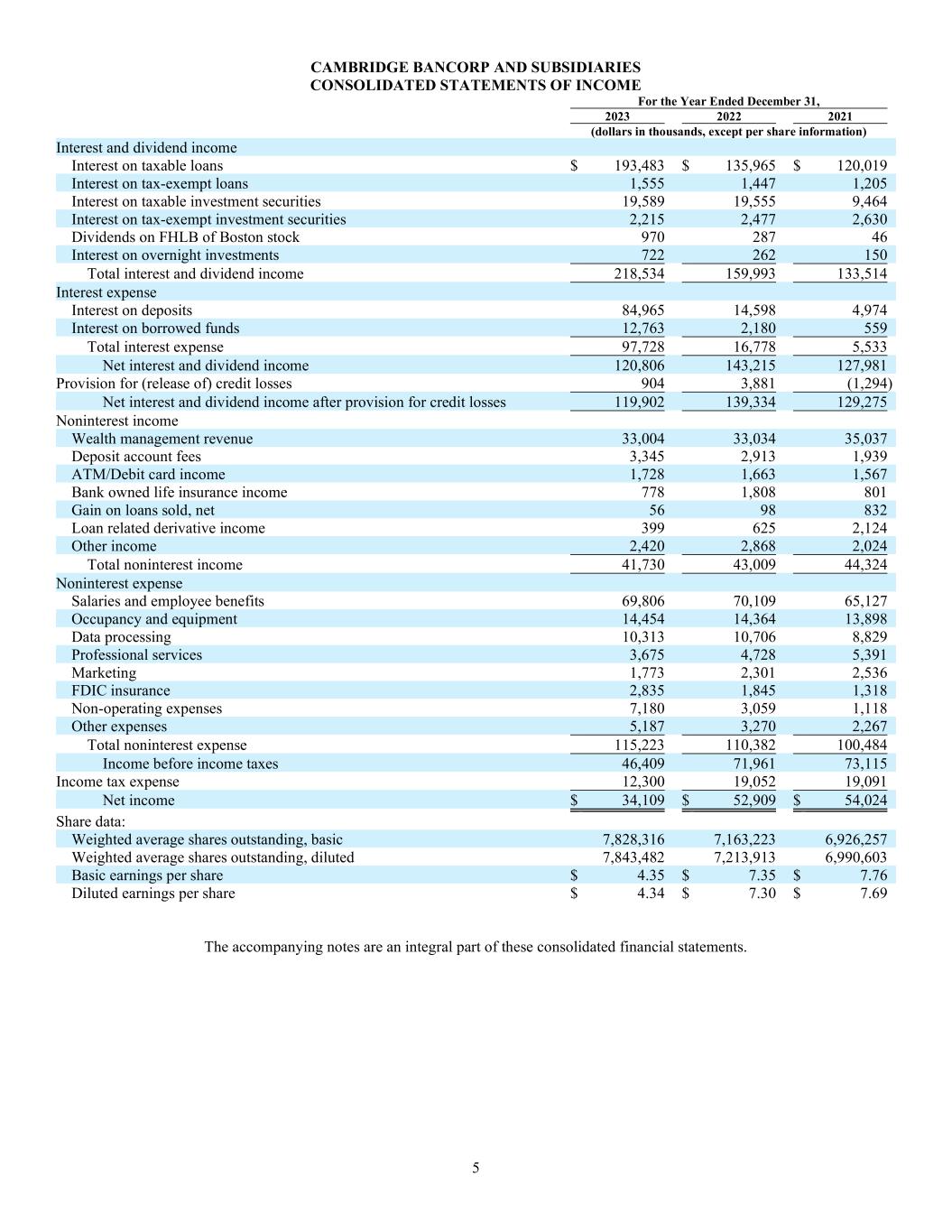 5 CAMBRIDGE BANCORP AND SUBSIDIARIES CONSOLIDATED STATEMENTS OF INCOME For the Year Ended December 31, 2023 2022 2021 (dollars in thousands, except per share information) Interest and dividend income Interest on taxable loans $ 193,483 $ 135,965 $ 120,019 Interest on tax-exempt loans 1,555 1,447 1,205 Interest on taxable investment securities 19,589 19,555 9,464 Interest on tax-exempt investment securities 2,215 2,477 2,630 Dividends on FHLB of Boston stock 970 287 46 Interest on overnight investments 722 262 150 Total interest and dividend income 218,534 159,993 133,514 Interest expense Interest on deposits 84,965 14,598 4,974 Interest on borrowed funds 12,763 2,180 559 Total interest expense 97,728 16,778 5,533 Net interest and dividend income 120,806 143,215 127,981 Provision for (release of) credit losses 904 3,881 (1,294) Net interest and dividend income after provision for credit losses 119,902 139,334 129,275 Noninterest income Wealth management revenue 33,004 33,034 35,037 Deposit account fees 3,345 2,913 1,939 ATM/Debit card income 1,728 1,663 1,567 Bank owned life insurance income 778 1,808 801 Gain on loans sold, net 56 98 832 Loan related derivative income 399 625 2,124 Other income 2,420 2,868 2,024 Total noninterest income 41,730 43,009 44,324 Noninterest expense Salaries and employee benefits 69,806 70,109 65,127 Occupancy and equipment 14,454 14,364 13,898 Data processing 10,313 10,706 8,829 Professional services 3,675 4,728 5,391 Marketing 1,773 2,301 2,536 FDIC insurance 2,835 1,845 1,318 Non-operating expenses 7,180 3,059 1,118 Other expenses 5,187 3,270 2,267 Total noninterest expense 115,223 110,382 100,484 Income before income taxes 46,409 71,961 73,115 Income tax expense 12,300 19,052 19,091 Net income $ 34,109 $ 52,909 $ 54,024 Share data: Weighted average shares outstanding, basic 7,828,316 7,163,223 6,926,257 Weighted average shares outstanding, diluted 7,843,482 7,213,913 6,990,603 Basic earnings per share $ 4.35 $ 7.35 $ 7.76 Diluted earnings per share $ 4.34 $ 7.30 $ 7.69 The accompanying notes are an integral part of these consolidated financial statements.