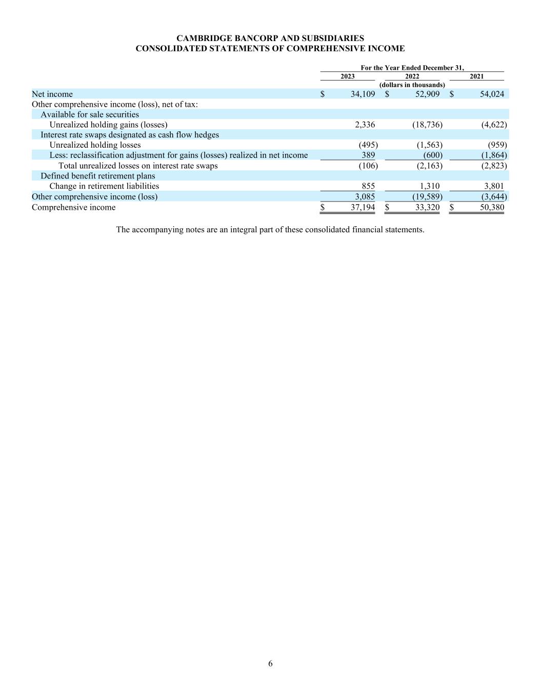 6 CAMBRIDGE BANCORP AND SUBSIDIARIES CONSOLIDATED STATEMENTS OF COMPREHENSIVE INCOME For the Year Ended December 31, 2023 2022 2021 (dollars in thousands) Net income $ 34,109 $ 52,909 $ 54,024 Other comprehensive income (loss), net of tax: Available for sale securities Unrealized holding gains (losses) 2,336 (18,736) (4,622) Interest rate swaps designated as cash flow hedges Unrealized holding losses (495) (1,563) (959) Less: reclassification adjustment for gains (losses) realized in net income 389 (600) (1,864) Total unrealized losses on interest rate swaps (106) (2,163) (2,823) Defined benefit retirement plans Change in retirement liabilities 855 1,310 3,801 Other comprehensive income (loss) 3,085 (19,589) (3,644) Comprehensive income $ 37,194 $ 33,320 $ 50,380 The accompanying notes are an integral part of these consolidated financial statements.