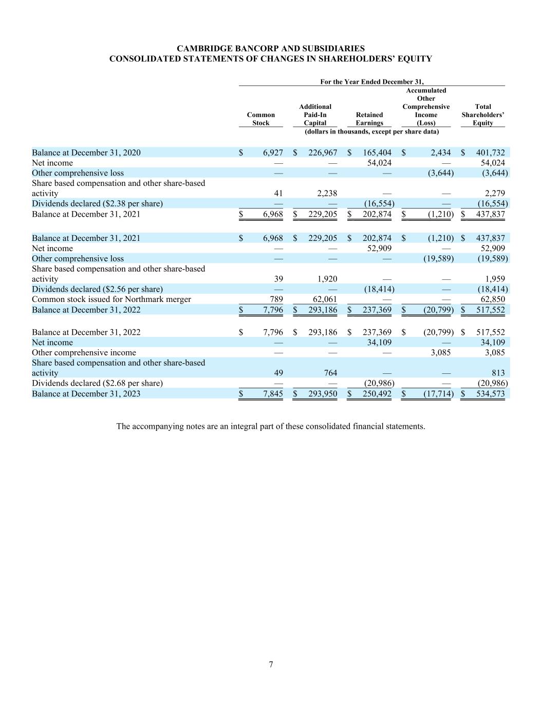7 CAMBRIDGE BANCORP AND SUBSIDIARIES CONSOLIDATED STATEMENTS OF CHANGES IN SHAREHOLDERS’ EQUITY For the Year Ended December 31, Common Stock Additional Paid-In Capital Retained Earnings Accumulated Other Comprehensive Income (Loss) Total Shareholders’ Equity (dollars in thousands, except per share data) Balance at December 31, 2020 $ 6,927 $ 226,967 $ 165,404 $ 2,434 $ 401,732 Net income — — 54,024 — 54,024 Other comprehensive loss — — — (3,644) (3,644) Share based compensation and other share-based activity 41 2,238 — — 2,279 Dividends declared ($2.38 per share) — — (16,554) — (16,554) Balance at December 31, 2021 $ 6,968 $ 229,205 $ 202,874 $ (1,210) $ 437,837 Balance at December 31, 2021 $ 6,968 $ 229,205 $ 202,874 $ (1,210) $ 437,837 Net income — — 52,909 — 52,909 Other comprehensive loss — — — (19,589) (19,589) Share based compensation and other share-based activity 39 1,920 — — 1,959 Dividends declared ($2.56 per share) — — (18,414) — (18,414) Common stock issued for Northmark merger 789 62,061 — — 62,850 Balance at December 31, 2022 $ 7,796 $ 293,186 $ 237,369 $ (20,799) $ 517,552 Balance at December 31, 2022 $ 7,796 $ 293,186 $ 237,369 $ (20,799) $ 517,552 Net income — — 34,109 — 34,109 Other comprehensive income — — — 3,085 3,085 Share based compensation and other share-based activity 49 764 — — 813 Dividends declared ($2.68 per share) — — (20,986) — (20,986) Balance at December 31, 2023 $ 7,845 $ 293,950 $ 250,492 $ (17,714) $ 534,573 The accompanying notes are an integral part of these consolidated financial statements.