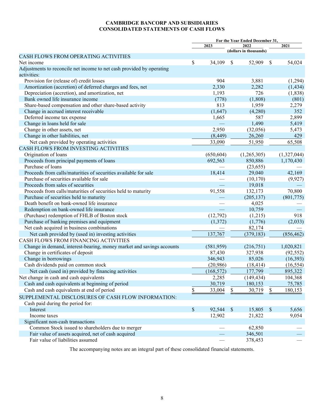 8 CAMBRIDGE BANCORP AND SUBSIDIARIES CONSOLIDATED STATEMENTS OF CASH FLOWS For the Year Ended December 31, 2023 2022 2021 (dollars in thousands) CASH FLOWS FROM OPERATING ACTIVITIES Net income $ 34,109 $ 52,909 $ 54,024 Adjustments to reconcile net income to net cash provided by operating activities: Provision for (release of) credit losses 904 3,881 (1,294) Amortization (accretion) of deferred charges and fees, net 2,330 2,282 (1,434) Depreciation (accretion), and amortization, net 1,193 726 (1,838) Bank owned life insurance income (778) (1,808) (801) Share-based compensation and other share-based activity 813 1,959 2,279 Change in accrued interest receivable (1,647) (4,280) 352 Deferred income tax expense 1,665 587 2,899 Change in loans held for sale — 1,490 5,419 Change in other assets, net 2,950 (32,056) 5,473 Change in other liabilities, net (8,449) 26,260 429 Net cash provided by operating activities 33,090 51,950 65,508 CASH FLOWS FROM INVESTING ACTIVITIES Origination of loans (650,604) (1,265,305) (1,327,044) Proceeds from principal payments of loans 692,563 850,886 1,170,430 Purchase of loans — (23,655) — Proceeds from calls/maturities of securities available for sale 18,414 29,040 42,169 Purchase of securities available for sale — (10,170) (9,927) Proceeds from sales of securities — 19,018 — Proceeds from calls/maturities of securities held to maturity 91,558 132,173 70,800 Purchase of securities held to maturity — (205,137) (801,775) Death benefit on bank-owned life insurance — 4,025 — Redemption on bank-owned life insurance — 10,759 — (Purchase) redemption of FHLB of Boston stock (12,792) (1,215) 918 Purchase of banking premises and equipment (1,372) (1,776) (2,033) Net cash acquired in business combinations — 82,174 — Net cash provided by (used in) investing activities 137,767 (379,183) (856,462) CASH FLOWS FROM FINANCING ACTIVITIES Change in demand, interest-bearing, money market and savings accounts (581,959) (216,751) 1,020,821 Change in certificates of deposit 87,430 327,938 (92,552) Change in borrowings 346,943 85,026 (16,393) Cash dividends paid on common stock (20,986) (18,414) (16,554) Net cash (used in) provided by financing activities (168,572) 177,799 895,322 Net change in cash and cash equivalents 2,285 (149,434) 104,368 Cash and cash equivalents at beginning of period 30,719 180,153 75,785 Cash and cash equivalents at end of period $ 33,004 $ 30,719 $ 180,153 SUPPLEMENTAL DISCLOSURES OF CASH FLOW INFORMATION: Cash paid during the period for: Interest $ 92,544 $ 15,805 $ 5,656 Income taxes 12,902 21,822 9,054 Significant non-cash transactions Common Stock issued to shareholders due to merger — 62,850 — Fair value of assets acquired, net of cash acquired — 346,501 — Fair value of liabilities assumed — 378,453 — The accompanying notes are an integral part of these consolidated financial statements.