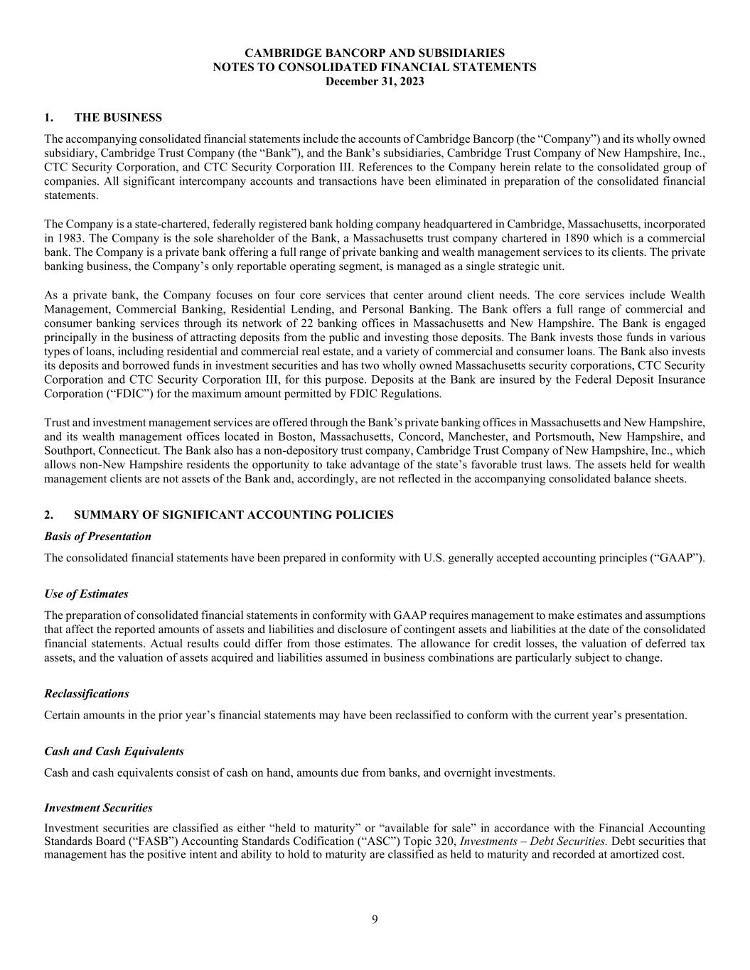 9 CAMBRIDGE BANCORP AND SUBSIDIARIES NOTES TO CONSOLIDATED FINANCIAL STATEMENTS December 31, 2023 1. THE BUSINESS The accompanying consolidated financial statements include the accounts of Cambridge Bancorp (the “Company”) and its wholly owned subsidiary, Cambridge Trust Company (the “Bank”), and the Bank’s subsidiaries, Cambridge Trust Company of New Hampshire, Inc., CTC Security Corporation, and CTC Security Corporation III. References to the Company herein relate to the consolidated group of companies. All significant intercompany accounts and transactions have been eliminated in preparation of the consolidated financial statements. The Company is a state-chartered, federally registered bank holding company headquartered in Cambridge, Massachusetts, incorporated in 1983. The Company is the sole shareholder of the Bank, a Massachusetts trust company chartered in 1890 which is a commercial bank. The Company is a private bank offering a full range of private banking and wealth management services to its clients. The private banking business, the Company’s only reportable operating segment, is managed as a single strategic unit. As a private bank, the Company focuses on four core services that center around client needs. The core services include Wealth Management, Commercial Banking, Residential Lending, and Personal Banking. The Bank offers a full range of commercial and consumer banking services through its network of 22 banking offices in Massachusetts and New Hampshire. The Bank is engaged principally in the business of attracting deposits from the public and investing those deposits. The Bank invests those funds in various types of loans, including residential and commercial real estate, and a variety of commercial and consumer loans. The Bank also invests its deposits and borrowed funds in investment securities and has two wholly owned Massachusetts security corporations, CTC Security Corporation and CTC Security Corporation III, for this purpose. Deposits at the Bank are insured by the Federal Deposit Insurance Corporation (“FDIC”) for the maximum amount permitted by FDIC Regulations. Trust and investment management services are offered through the Bank’s private banking offices in Massachusetts and New Hampshire, and its wealth management offices located in Boston, Massachusetts, Concord, Manchester, and Portsmouth, New Hampshire, and Southport, Connecticut. The Bank also has a non-depository trust company, Cambridge Trust Company of New Hampshire, Inc., which allows non-New Hampshire residents the opportunity to take advantage of the state’s favorable trust laws. The assets held for wealth management clients are not assets of the Bank and, accordingly, are not reflected in the accompanying consolidated balance sheets. 2. SUMMARY OF SIGNIFICANT ACCOUNTING POLICIES Basis of Presentation The consolidated financial statements have been prepared in conformity with U.S. generally accepted accounting principles (“GAAP”). Use of Estimates The preparation of consolidated financial statements in conformity with GAAP requires management to make estimates and assumptions that affect the reported amounts of assets and liabilities and disclosure of contingent assets and liabilities at the date of the consolidated financial statements. Actual results could differ from those estimates. The allowance for credit losses, the valuation of deferred tax assets, and the valuation of assets acquired and liabilities assumed in business combinations are particularly subject to change. Reclassifications Certain amounts in the prior year’s financial statements may have been reclassified to conform with the current year’s presentation. Cash and Cash Equivalents Cash and cash equivalents consist of cash on hand, amounts due from banks, and overnight investments. Investment Securities Investment securities are classified as either “held to maturity” or “available for sale” in accordance with the Financial Accounting Standards Board (“FASB”) Accounting Standards Codification (“ASC”) Topic 320, Investments – Debt Securities. Debt securities that management has the positive intent and ability to hold to maturity are classified as held to maturity and recorded at amortized cost.