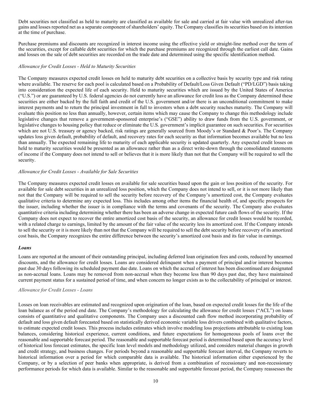 10 Debt securities not classified as held to maturity are classified as available for sale and carried at fair value with unrealized after-tax gains and losses reported net as a separate component of shareholders’ equity. The Company classifies its securities based on its intention at the time of purchase. Purchase premiums and discounts are recognized in interest income using the effective yield or straight-line method over the term of the securities, except for callable debt securities for which the purchase premiums are recognized through the earliest call date. Gains and losses on the sale of debt securities are recorded on the trade date and determined using the specific identification method. Allowance for Credit Losses - Held to Maturity Securities The Company measures expected credit losses on held to maturity debt securities on a collective basis by security type and risk rating where available. The reserve for each pool is calculated based on a Probability of Default/Loss Given Default (“PD/LGD”) basis taking into consideration the expected life of each security. Held to maturity securities which are issued by the United States of America (“U.S.”) or are guaranteed by U.S. federal agencies do not currently have an allowance for credit loss as the Company determined these securities are either backed by the full faith and credit of the U.S. government and/or there is an unconditional commitment to make interest payments and to return the principal investment in full to investors when a debt security reaches maturity. The Company will evaluate this position no less than annually, however, certain items which may cause the Company to change this methodology include legislative changes that remove a government-sponsored enterprise’s (“GSE”) ability to draw funds from the U.S. government, or legislative changes to housing policy that reduce or eliminate the U.S. government’s implicit guarantee on such securities. For securities which are not U.S. treasury or agency backed, risk ratings are generally sourced from Moody’s or Standard & Poor’s. The Company updates loss given default, probability of default, and recovery rates for each security as that information becomes available but no less than annually. The expected remaining life to maturity of each applicable security is updated quarterly. Any expected credit losses on held to maturity securities would be presented as an allowance rather than as a direct write-down through the consolidated statements of income if the Company does not intend to sell or believes that it is more likely than not that the Company will be required to sell the security. Allowance for Credit Losses - Available for Sale Securities The Company measures expected credit losses on available for sale securities based upon the gain or loss position of the security. For available for sale debt securities in an unrealized loss position, which the Company does not intend to sell, or it is not more likely than not that the Company will be required to sell the security before recovery of the Company’s amortized cost, the Company evaluates qualitative criteria to determine any expected loss. This includes among other items the financial health of, and specific prospects for the issuer, including whether the issuer is in compliance with the terms and covenants of the security. The Company also evaluates quantitative criteria including determining whether there has been an adverse change in expected future cash flows of the security. If the Company does not expect to recover the entire amortized cost basis of the security, an allowance for credit losses would be recorded, with a related charge to earnings, limited by the amount of the fair value of the security less its amortized cost. If the Company intends to sell the security or it is more likely than not that the Company will be required to sell the debt security before recovery of its amortized cost basis, the Company recognizes the entire difference between the security’s amortized cost basis and its fair value in earnings. Loans Loans are reported at the amount of their outstanding principal, including deferred loan origination fees and costs, reduced by unearned discounts, and the allowance for credit losses. Loans are considered delinquent when a payment of principal and/or interest becomes past due 30 days following its scheduled payment due date. Loans on which the accrual of interest has been discontinued are designated as non-accrual loans. Loans may be removed from non-accrual when they become less than 90 days past due, they have maintained current payment status for a sustained period of time, and when concern no longer exists as to the collectability of principal or interest. Allowance for Credit Losses - Loans Losses on loan receivables are estimated and recognized upon origination of the loan, based on expected credit losses for the life of the loan balance as of the period end date. The Company’s methodology for calculating the allowance for credit losses (“ACL”) on loans consists of quantitative and qualitative components. The Company uses a discounted cash flow method incorporating probability of default and loss given default forecasted based on statistically derived economic variable loss drivers combined with qualitative factors, to estimate expected credit losses. This process includes estimates which involve modeling loss projections attributable to existing loan balances, considering historical experience, current conditions, and future expectations for homogeneous pools of loans over the reasonable and supportable forecast period. The reasonable and supportable forecast period is determined based upon the accuracy level of historical loss forecast estimates, the specific loan level models and methodology utilized, and considers material changes in growth and credit strategy, and business changes. For periods beyond a reasonable and supportable forecast interv