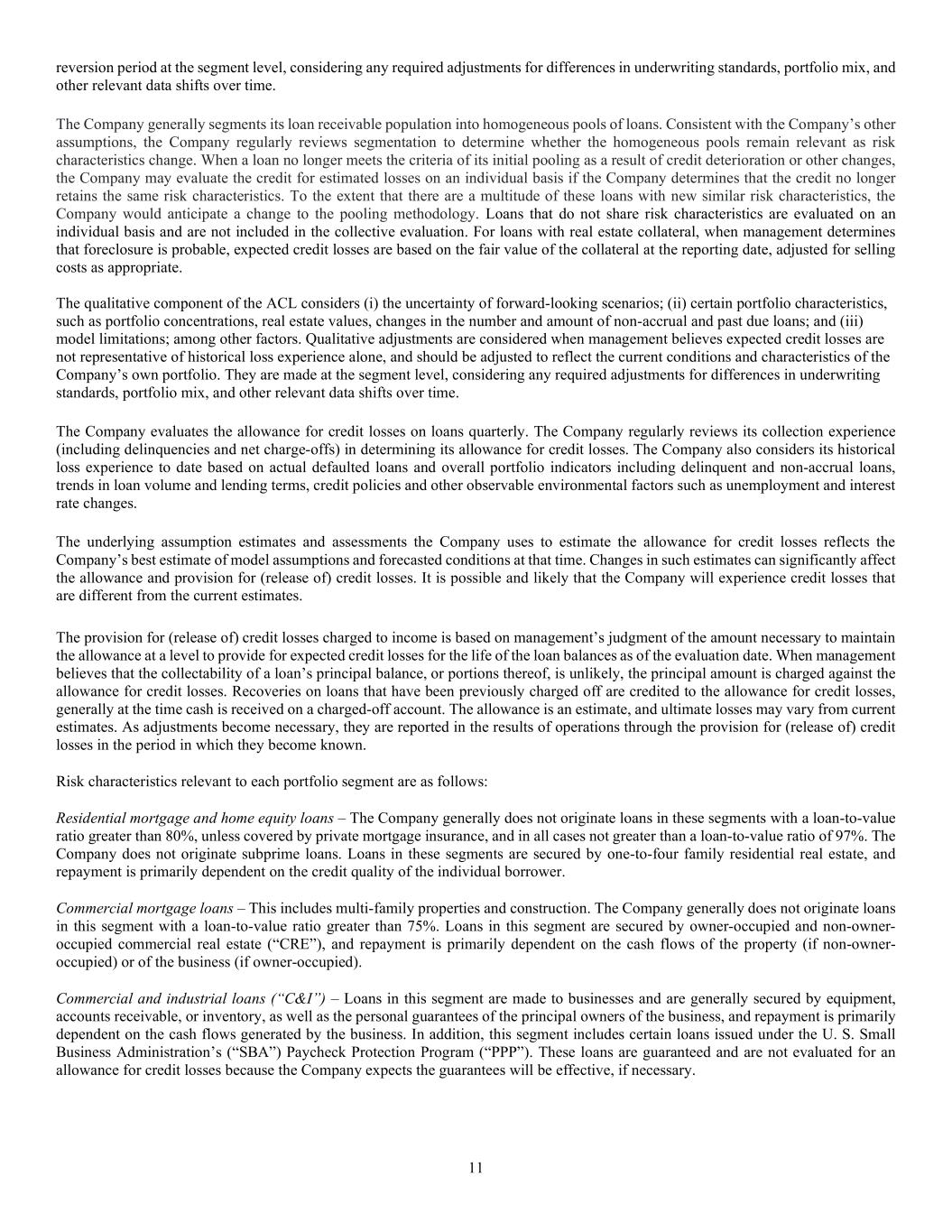 11 reversion period at the segment level, considering any required adjustments for differences in underwriting standards, portfolio mix, and other relevant data shifts over time. The Company generally segments its loan receivable population into homogeneous pools of loans. Consistent with the Company’s other assumptions, the Company regularly reviews segmentation to determine whether the homogeneous pools remain relevant as risk characteristics change. When a loan no longer meets the criteria of its initial pooling as a result of credit deterioration or other changes, the Company may evaluate the credit for estimated losses on an individual basis if the Company determines that the credit no longer retains the same risk characteristics. To the extent that there are a multitude of these loans with new similar risk characteristics, the Company would anticipate a change to the pooling methodology. Loans that do not share risk characteristics are evaluated on an individual basis and are not included in the collective evaluation. For loans with real estate collateral, when management determines that foreclosure is probable, expected credit losses are based on the fair value of the collateral at the reporting date, adjusted for selling costs as appropriate. The qualitative component of the ACL considers (i) the uncertainty of forward-looking scenarios; (ii) certain portfolio characteristics, such as portfolio concentrations, real estate values, changes in the number and amount of non-accrual and past due loans; and (iii) model limitations; among other factors. Qualitative adjustments are considered when management believes expected credit losses are not representative of historical loss experience alone, and should be adjusted to reflect the current conditions and characteristics of the Company’s own portfolio. They are made at the segment level, considering any required adjustments for differences in underwriting standards, portfolio mix, and other relevant data shifts over time. The Company evaluates the allowance for credit losses on loans quarterly. The Company regularly reviews its collection experience (including delinquencies and net charge-offs) in determining its allowance for credit losses. The Company also considers its historical loss experience to date based on actual defaulted loans and overall portfolio indicators including delinquent and non-accrual loans, trends in loan volume and lending terms, credit policies and other observable environmental factors such as unemployment and interest rate changes. The underlying assumption estimates and assessments the Company uses to estimate the allowance for credit losses reflects the Company’s best estimate of model assumptions and forecasted conditions at that time. Changes in such estimates can significantly affect the allowance and provision for (release of) credit losses. It is possible and likely that the Company will experience credit losses that are different from the current estimates. The provision for (release of) credit losses charged to income is based on management’s judgment of the amount necessary to maintain the allowance at a level to provide for expected credit losses for the life of the loan balances as of the evaluation date. When management believes that the collectability of a loan’s principal balance, or portions thereof, is unlikely, the principal amount is charged against the allowance for credit losses. Recoveries on loans that have been previously charged off are credited to the allowance for credit losses, generally at the time cash is received on a charged-off account. The allowance is an estimate, and ultimate losses may vary from current estimates. As adjustments become necessary, they are reported in the results of operations through the provision for (release of) credit losses in the period in which they become known. Risk characteristics relevant to each portfolio segment are as follows: Residential mortgage and home equity loans – The Company generally does not originate loans in these segments with a loan-to-value ratio greater than 80%, unless covered by private mortgage insurance, and in all cases not greater than a loan-to-value ratio of 97%. The Company does not originate subprime loans. Loans in these segments are secured by one-to-four family residential real estate, and repayment is primarily dependent on the credit quality of the individual borrower. Commercial mortgage loans – This includes multi-family properties and construction. The Company generally does not originate loans in this segment with a loan-to-value ratio greater than 75%. Loans in this segment are secured by owner-occupied and non-owner- occupied commercial real estate (“CRE”), and repayment is primarily dependent on the cash flows of the property (if non-owner- occupied) or of the business (if owner-occupied). Commercial and industrial loans (“C&I”) – Loans in this segment are made to businesses and are generally secured by equipment, accounts receivable, or inventory, as well as the personal guarantees of the principal owners of the business, and repayment is primarily dependent on the cash flows generated by the business. In addition, this segment includes certain loans issued under the U. S. Small Business Administration’s (“SBA”) Paycheck Protection Program (“PPP”). These loans are guaranteed and are not evaluated for an allowance for credit losses because the Company expects the guarantees will be effective, if necessary.