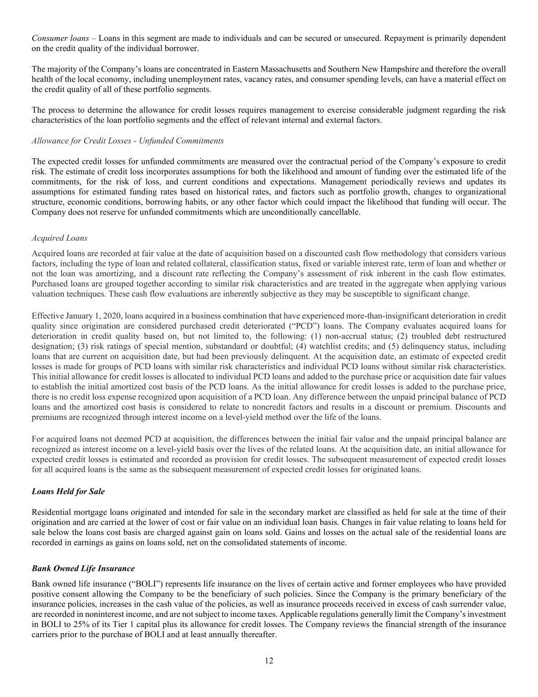 12 Consumer loans – Loans in this segment are made to individuals and can be secured or unsecured. Repayment is primarily dependent on the credit quality of the individual borrower. The majority of the Company’s loans are concentrated in Eastern Massachusetts and Southern New Hampshire and therefore the overall health of the local economy, including unemployment rates, vacancy rates, and consumer spending levels, can have a material effect on the credit quality of all of these portfolio segments. The process to determine the allowance for credit losses requires management to exercise considerable judgment regarding the risk characteristics of the loan portfolio segments and the effect of relevant internal and external factors. Allowance for Credit Losses - Unfunded Commitments The expected credit losses for unfunded commitments are measured over the contractual period of the Company’s exposure to credit risk. The estimate of credit loss incorporates assumptions for both the likelihood and amount of funding over the estimated life of the commitments, for the risk of loss, and current conditions and expectations. Management periodically reviews and updates its assumptions for estimated funding rates based on historical rates, and factors such as portfolio growth, changes to organizational structure, economic conditions, borrowing habits, or any other factor which could impact the likelihood that funding will occur. The Company does not reserve for unfunded commitments which are unconditionally cancellable. Acquired Loans Acquired loans are recorded at fair value at the date of acquisition based on a discounted cash flow methodology that considers various factors, including the type of loan and related collateral, classification status, fixed or variable interest rate, term of loan and whether or not the loan was amortizing, and a discount rate reflecting the Company’s assessment of risk inherent in the cash flow estimates. Purchased loans are grouped together according to similar risk characteristics and are treated in the aggregate when applying various valuation techniques. These cash flow evaluations are inherently subjective as they may be susceptible to significant change. Effective January 1, 2020, loans acquired in a business combination that have experienced more-than-insignificant deterioration in credit quality since origination are considered purchased credit deteriorated (“PCD”) loans. The Company evaluates acquired loans for deterioration in credit quality based on, but not limited to, the following: (1) non-accrual status; (2) troubled debt restructured designation; (3) risk ratings of special mention, substandard or doubtful; (4) watchlist credits; and (5) delinquency status, including loans that are current on acquisition date, but had been previously delinquent. At the acquisition date, an estimate of expected credit losses is made for groups of PCD loans with similar risk characteristics and individual PCD loans without similar risk characteristics. This initial allowance for credit losses is allocated to individual PCD loans and added to the purchase price or acquisition date fair values to establish the initial amortized cost basis of the PCD loans. As the initial allowance for credit losses is added to the purchase price, there is no credit loss expense recognized upon acquisition of a PCD loan. Any difference between the unpaid principal balance of PCD loans and the amortized cost basis is considered to relate to noncredit factors and results in a discount or premium. Discounts and premiums are recognized through interest income on a level-yield method over the life of the loans. For acquired loans not deemed PCD at acquisition, the differences between the initial fair value and the unpaid principal balance are recognized as interest income on a level-yield basis over the lives of the related loans. At the acquisition date, an initial allowance for expected credit losses is estimated and recorded as provision for credit losses. The subsequent measurement of expected credit losses for all acquired loans is the same as the subsequent measurement of expected credit losses for originated loans. Loans Held for Sale Residential mortgage loans originated and intended for sale in the secondary market are classified as held for sale at the time of their origination and are carried at the lower of cost or fair value on an individual loan basis. Changes in fair value relating to loans held for sale below the loans cost basis are charged against gain on loans sold. Gains and losses on the actual sale of the residential loans are recorded in earnings as gains on loans sold, net on the consolidated statements of income. Bank Owned Life Insurance Bank owned life insurance (“BOLI”) represents life insurance on the lives of certain active and former employees who have provided positive consent allowing the Company to be the beneficiary of such policies. Since the Company is the primary beneficiary of the insurance policies, increases in the cash value of the policies, as well as insurance proceeds received in excess of cash surrender value, are recorded in noninterest income, and are not subject to income taxes. Applicable regulations generally limit the Company’s investment in BOLI to 25% of its Tier 1 capital plus its allowance for credit losses. The Company reviews the financial strength of the insurance carriers prior to the purchase of BOLI and at least annually thereafter.