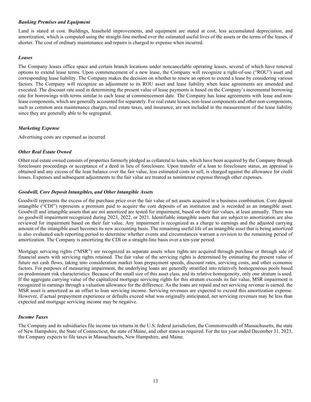 13 Banking Premises and Equipment Land is stated at cost. Buildings, leasehold improvements, and equipment are stated at cost, less accumulated depreciation, and amortization, which is computed using the straight-line method over the estimated useful lives of the assets or the terms of the leases, if shorter. The cost of ordinary maintenance and repairs is charged to expense when incurred. Leases The Company leases office space and certain branch locations under noncancelable operating leases, several of which have renewal options to extend lease terms. Upon commencement of a new lease, the Company will recognize a right-of-use (“ROU”) asset and corresponding lease liability. The Company makes the decision on whether to renew an option to extend a lease by considering various factors. The Company will recognize an adjustment to its ROU asset and lease liability when lease agreements are amended and executed. The discount rate used in determining the present value of lease payments is based on the Company’s incremental borrowing rate for borrowings with terms similar to each lease at commencement date. The Company has lease agreements with lease and non- lease components, which are generally accounted for separately. For real estate leases, non-lease components and other non-components, such as common area maintenance charges, real estate taxes, and insurance, are not included in the measurement of the lease liability since they are generally able to be segregated. Marketing Expense Advertising costs are expensed as incurred. Other Real Estate Owned Other real estate owned consists of properties formerly pledged as collateral to loans, which have been acquired by the Company through foreclosure proceedings or acceptance of a deed in lieu of foreclosure. Upon transfer of a loan to foreclosure status, an appraisal is obtained and any excess of the loan balance over the fair value, less estimated costs to sell, is charged against the allowance for credit losses. Expenses and subsequent adjustments to the fair value are treated as noninterest expense through other expenses. Goodwill, Core Deposit Intangibles, and Other Intangible Assets Goodwill represents the excess of the purchase price over the fair value of net assets acquired in a business combination. Core deposit intangible (“CDI”) represents a premium paid to acquire the core deposits of an institution and is recorded as an intangible asset. Goodwill and intangible assets that are not amortized are tested for impairment, based on their fair values, at least annually. There was no goodwill impairment recognized during 2023, 2022, or 2021. Identifiable intangible assets that are subject to amortization are also reviewed for impairment based on their fair value. Any impairment is recognized as a charge to earnings and the adjusted carrying amount of the intangible asset becomes its new accounting basis. The remaining useful life of an intangible asset that is being amortized is also evaluated each reporting period to determine whether events and circumstances warrant a revision to the remaining period of amortization. The Company is amortizing the CDI on a straight-line basis over a ten-year period. Mortgage servicing rights (“MSR”) are recognized as separate assets when rights are acquired through purchase or through sale of financial assets with servicing rights retained. The fair value of the servicing rights is determined by estimating the present value of future net cash flows, taking into consideration market loan prepayment speeds, discount rates, servicing costs, and other economic factors. For purposes of measuring impairment, the underlying loans are generally stratified into relatively homogeneous pools based on predominant risk characteristics. Because of the small size of this asset class, and its relative homogeneity, only one stratum is used. If the aggregate carrying value of the capitalized mortgage servicing rights for this stratum exceeds its fair value, MSR impairment is recognized in earnings through a valuation allowance for the difference. As the loans are repaid and net servicing revenue is earned, the MSR asset is amortized as an offset to loan servicing income. Servicing revenues are expected to exceed this amortization expense. However, if actual prepayment experience or defaults exceed what was originally anticipated, net servicing revenues may be less than expected and mortgage servicing income may be negative. Income Taxes The Company and its subsidiaries file income tax returns in the U.S. federal jurisdiction, the Commonwealth of Massachusetts, the state of New Hampshire, the State of Connecticut, the state of Maine, and other states as required. For the tax year ended December 31, 2023, the Company expects to file taxes in Massachusetts, New Hampshire, and Maine.