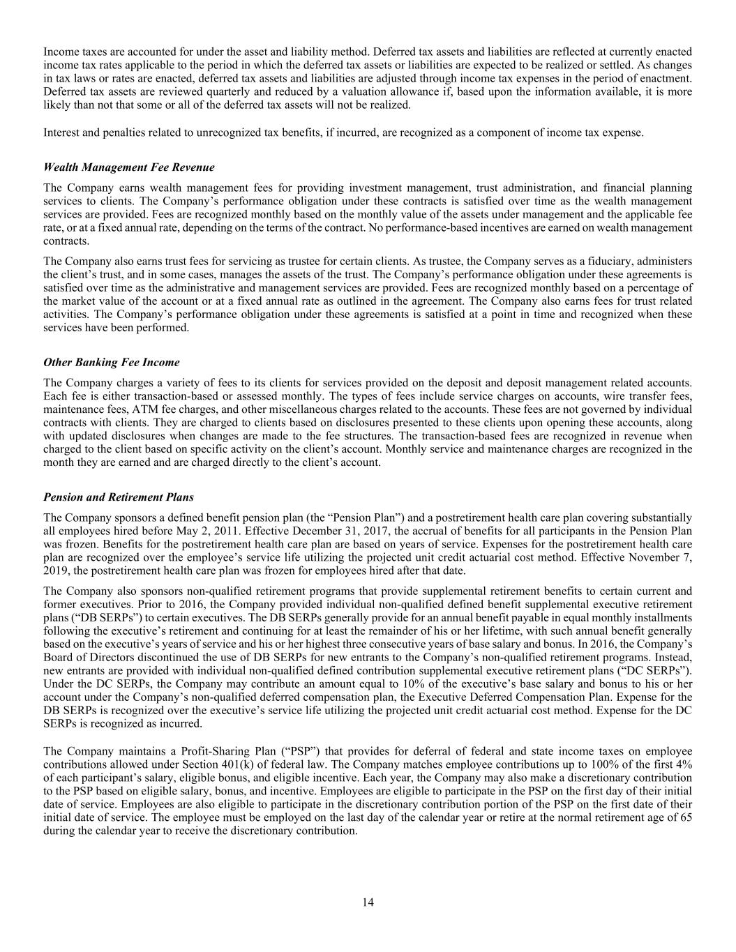 14 Income taxes are accounted for under the asset and liability method. Deferred tax assets and liabilities are reflected at currently enacted income tax rates applicable to the period in which the deferred tax assets or liabilities are expected to be realized or settled. As changes in tax laws or rates are enacted, deferred tax assets and liabilities are adjusted through income tax expenses in the period of enactment. Deferred tax assets are reviewed quarterly and reduced by a valuation allowance if, based upon the information available, it is more likely than not that some or all of the deferred tax assets will not be realized. Interest and penalties related to unrecognized tax benefits, if incurred, are recognized as a component of income tax expense. Wealth Management Fee Revenue The Company earns wealth management fees for providing investment management, trust administration, and financial planning services to clients. The Company’s performance obligation under these contracts is satisfied over time as the wealth management services are provided. Fees are recognized monthly based on the monthly value of the assets under management and the applicable fee rate, or at a fixed annual rate, depending on the terms of the contract. No performance-based incentives are earned on wealth management contracts. The Company also earns trust fees for servicing as trustee for certain clients. As trustee, the Company serves as a fiduciary, administers the client’s trust, and in some cases, manages the assets of the trust. The Company’s performance obligation under these agreements is satisfied over time as the administrative and management services are provided. Fees are recognized monthly based on a percentage of the market value of the account or at a fixed annual rate as outlined in the agreement. The Company also earns fees for trust related activities. The Company’s performance obligation under these agreements is satisfied at a point in time and recognized when these services have been performed. Other Banking Fee Income The Company charges a variety of fees to its clients for services provided on the deposit and deposit management related accounts. Each fee is either transaction-based or assessed monthly. The types of fees include service charges on accounts, wire transfer fees, maintenance fees, ATM fee charges, and other miscellaneous charges related to the accounts. These fees are not governed by individual contracts with clients. They are charged to clients based on disclosures presented to these clients upon opening these accounts, along with updated disclosures when changes are made to the fee structures. The transaction-based fees are recognized in revenue when charged to the client based on specific activity on the client’s account. Monthly service and maintenance charges are recognized in the month they are earned and are charged directly to the client’s account. Pension and Retirement Plans The Company sponsors a defined benefit pension plan (the “Pension Plan”) and a postretirement health care plan covering substantially all employees hired before May 2, 2011. Effective December 31, 2017, the accrual of benefits for all participants in the Pension Plan was frozen. Benefits for the postretirement health care plan are based on years of service. Expenses for the postretirement health care plan are recognized over the employee’s service life utilizing the projected unit credit actuarial cost method. Effective November 7, 2019, the postretirement health care plan was frozen for employees hired after that date. The Company also sponsors non-qualified retirement programs that provide supplemental retirement benefits to certain current and former executives. Prior to 2016, the Company provided individual non-qualified defined benefit supplemental executive retirement plans (“DB SERPs”) to certain executives. The DB SERPs generally provide for an annual benefit payable in equal monthly installments following the executive’s retirement and continuing for at least the remainder of his or her lifetime, with such annual benefit generally based on the executive’s years of service and his or her highest three consecutive years of base salary and bonus. In 2016, the Company’s Board of Directors discontinued the use of DB SERPs for new entrants to the Company’s non-qualified retirement programs. Instead, new entrants are provided with individual non-qualified defined contribution supplemental executive retirement plans (“DC SERPs”). Under the DC SERPs, the Company may contribute an amount equal to 10% of the executive’s base salary and bonus to his or her account under the Company’s non-qualified deferred compensation plan, the Executive Deferred Compensation Plan. Expense for the DB SERPs is recognized over the executive’s service life utilizing the projected unit credit actuarial cost method. Expense for the DC SERPs is recognized as incurred. The Company maintains a Profit-Sharing Plan (“PSP”) that provides for deferral of federal and state income taxes on employee contributions allowed under Section 401(k) of federal law. The Company matches employee contributions up to 100% of the first 4% of each participant’s salary, eligible bonus, and eligible incentive. Each year, the Company may also make a discretionary contribution to the PSP based on eligible salary, bonus, and incentive. Employees are eligible to participate in the PSP on the first day of their initial date of service. Employees are also eligible to participate in the discretionary contribution portion of the PSP on the first date of their initial date of service. The employee must be employed on the last day of the calendar year or retire at the normal retirement age of 65 during the calendar year to receive the discretionary contribution.