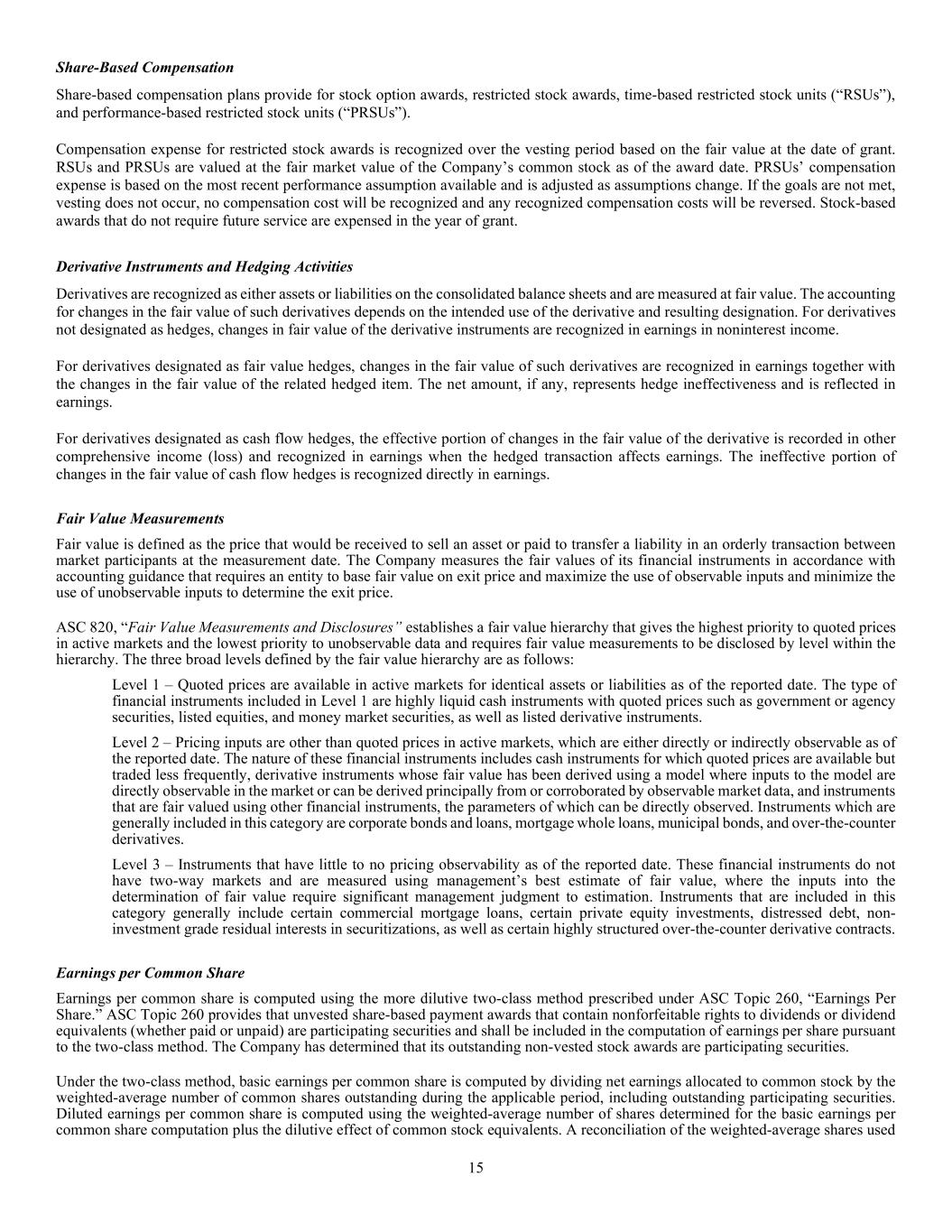 15 Share-Based Compensation Share-based compensation plans provide for stock option awards, restricted stock awards, time-based restricted stock units (“RSUs”), and performance-based restricted stock units (“PRSUs”). Compensation expense for restricted stock awards is recognized over the vesting period based on the fair value at the date of grant. RSUs and PRSUs are valued at the fair market value of the Company’s common stock as of the award date. PRSUs’ compensation expense is based on the most recent performance assumption available and is adjusted as assumptions change. If the goals are not met, vesting does not occur, no compensation cost will be recognized and any recognized compensation costs will be reversed. Stock-based awards that do not require future service are expensed in the year of grant. Derivative Instruments and Hedging Activities Derivatives are recognized as either assets or liabilities on the consolidated balance sheets and are measured at fair value. The accounting for changes in the fair value of such derivatives depends on the intended use of the derivative and resulting designation. For derivatives not designated as hedges, changes in fair value of the derivative instruments are recognized in earnings in noninterest income. For derivatives designated as fair value hedges, changes in the fair value of such derivatives are recognized in earnings together with the changes in the fair value of the related hedged item. The net amount, if any, represents hedge ineffectiveness and is reflected in earnings. For derivatives designated as cash flow hedges, the effective portion of changes in the fair value of the derivative is recorded in other comprehensive income (loss) and recognized in earnings when the hedged transaction affects earnings. The ineffective portion of changes in the fair value of cash flow hedges is recognized directly in earnings. Fair Value Measurements Fair value is defined as the price that would be received to sell an asset or paid to transfer a liability in an orderly transaction between market participants at the measurement date. The Company measures the fair values of its financial instruments in accordance with accounting guidance that requires an entity to base fair value on exit price and maximize the use of observable inputs and minimize the use of unobservable inputs to determine the exit price. ASC 820, “Fair Value Measurements and Disclosures” establishes a fair value hierarchy that gives the highest priority to quoted prices in active markets and the lowest priority to unobservable data and requires fair value measurements to be disclosed by level within the hierarchy. The three broad levels defined by the fair value hierarchy are as follows: Level 1 – Quoted prices are available in active markets for identical assets or liabilities as of the reported date. The type of financial instruments included in Level 1 are highly liquid cash instruments with quoted prices such as government or agency securities, listed equities, and money market securities, as well as listed derivative instruments. Level 2 – Pricing inputs are other than quoted prices in active markets, which are either directly or indirectly observable as of the reported date. The nature of these financial instruments includes cash instruments for which quoted prices are available but traded less frequently, derivative instruments whose fair value has been derived using a model where inputs to the model are directly observable in the market or can be derived principally from or corroborated by observable market data, and instruments that are fair valued using other financial instruments, the parameters of which can be directly observed. Instruments which are generally included in this category are corporate bonds and loans, mortgage whole loans, municipal bonds, and over-the-counter derivatives. Level 3 – Instruments that have little to no pricing observability as of the reported date. These financial instruments do not have two-way markets and are measured using management’s best estimate of fair value, where the inputs into the determination of fair value require significant management judgment to estimation. Instruments that are included in this category generally include certain commercial mortgage loans, certain private equity investments, distressed debt, non- investment grade residual interests in securitizations, as well as certain highly structured over-the-counter derivative contracts. Earnings per Common Share Earnings per common share is computed using the more dilutive two-class method prescribed under ASC Topic 260, “Earnings Per Share.” ASC Topic 260 provides that unvested share-based payment awards that contain nonforfeitable rights to dividends or dividend equivalents (whether paid or unpaid) are participating securities and shall be included in the computation of earnings per share pursuant to the two-class method. The Company has determined that its outstanding non-vested stock awards are participating securities. Under the two-class method, basic earnings per common share is computed by dividing net earnings allocated to common stock by the weighted-average number of common shares outstanding during the applicable period, including outstanding participating securities. Diluted earnings per common share is computed using the weighted-average number of shares determined for the basic earnings per common share computation plus the dilutive effect of common stock equivalents. A reconciliation of the weighted-average shares used