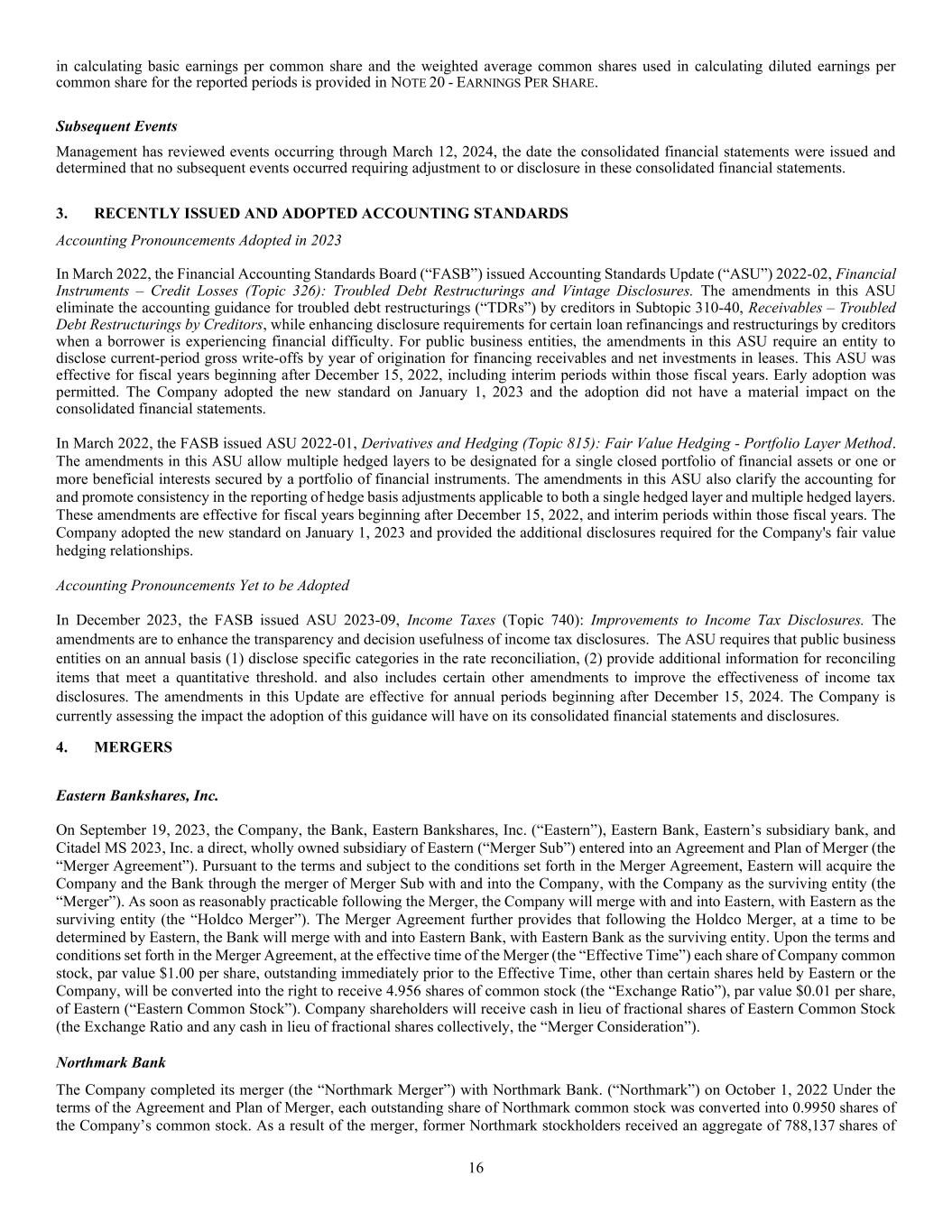 16 in calculating basic earnings per common share and the weighted average common shares used in calculating diluted earnings per common share for the reported periods is provided in NOTE 20 - EARNINGS PER SHARE. Subsequent Events Management has reviewed events occurring through March 12, 2024, the date the consolidated financial statements were issued and determined that no subsequent events occurred requiring adjustment to or disclosure in these consolidated financial statements. 3. RECENTLY ISSUED AND ADOPTED ACCOUNTING STANDARDS Accounting Pronouncements Adopted in 2023 In March 2022, the Financial Accounting Standards Board (“FASB”) issued Accounting Standards Update (“ASU”) 2022-02, Financial Instruments – Credit Losses (Topic 326): Troubled Debt Restructurings and Vintage Disclosures. The amendments in this ASU eliminate the accounting guidance for troubled debt restructurings (“TDRs”) by creditors in Subtopic 310-40, Receivables – Troubled Debt Restructurings by Creditors, while enhancing disclosure requirements for certain loan refinancings and restructurings by creditors when a borrower is experiencing financial difficulty. For public business entities, the amendments in this ASU require an entity to disclose current-period gross write-offs by year of origination for financing receivables and net investments in leases. This ASU was effective for fiscal years beginning after December 15, 2022, including interim periods within those fiscal years. Early adoption was permitted. The Company adopted the new standard on January 1, 2023 and the adoption did not have a material impact on the consolidated financial statements. In March 2022, the FASB issued ASU 2022-01, Derivatives and Hedging (Topic 815): Fair Value Hedging - Portfolio Layer Method. The amendments in this ASU allow multiple hedged layers to be designated for a single closed portfolio of financial assets or one or more beneficial interests secured by a portfolio of financial instruments. The amendments in this ASU also clarify the accounting for and promote consistency in the reporting of hedge basis adjustments applicable to both a single hedged layer and multiple hedged layers. These amendments are effective for fiscal years beginning after December 15, 2022, and interim periods within those fiscal years. The Company adopted the new standard on January 1, 2023 and provided the additional disclosures required for the Company's fair value hedging relationships. Accounting Pronouncements Yet to be Adopted In December 2023, the FASB issued ASU 2023-09, Income Taxes (Topic 740): Improvements to Income Tax Disclosures. The amendments are to enhance the transparency and decision usefulness of income tax disclosures. The ASU requires that public business entities on an annual basis (1) disclose specific categories in the rate reconciliation, (2) provide additional information for reconciling items that meet a quantitative threshold. and also includes certain other amendments to improve the effectiveness of income tax disclosures. The amendments in this Update are effective for annual periods beginning after December 15, 2024. The Company is currently assessing the impact the adoption of this guidance will have on its consolidated financial statements and disclosures. 4. MERGERS Eastern Bankshares, Inc. On September 19, 2023, the Company, the Bank, Eastern Bankshares, Inc. (“Eastern”), Eastern Bank, Eastern’s subsidiary bank, and Citadel MS 2023, Inc. a direct, wholly owned subsidiary of Eastern (“Merger Sub”) entered into an Agreement and Plan of Merger (the “Merger Agreement”). Pursuant to the terms and subject to the conditions set forth in the Merger Agreement, Eastern will acquire the Company and the Bank through the merger of Merger Sub with and into the Company, with the Company as the surviving entity (the “Merger”). As soon as reasonably practicable following the Merger, the Company will merge with and into Eastern, with Eastern as the surviving entity (the “Holdco Merger”). The Merger Agreement further provides that following the Holdco Merger, at a time to be determined by Eastern, the Bank will merge with and into Eastern Bank, with Eastern Bank as the surviving entity. Upon the terms and conditions set forth in the Merger Agreement, at the effective time of the Merger (the “Effective Time”) each share of Company common stock, par value $1.00 per share, outstanding immediately prior to the Effective Time, other than certain shares held by Eastern or the Company, will be converted into the right to receive 4.956 shares of common stock (the “Exchange Ratio”), par value $0.01 per share, of Eastern (“Eastern Common Stock”). Company shareholders will receive cash in lieu of fractional shares of Eastern Common Stock (the Exchange Ratio and any cash in lieu of fractional shares collectively, the “Merger Consideration”). Northmark Bank The Company completed its merger (the “Northmark Merger”) with Northmark Bank. (“Northmark”) on October 1, 2022 Under the terms of the Agreement and Plan of Merger, each outstanding share of Northmark common stock was converted into 0.9950 shares of the Company’s common stock. As a result of the merger, former Northmark stockholders received an aggregate of 788,137 shares of