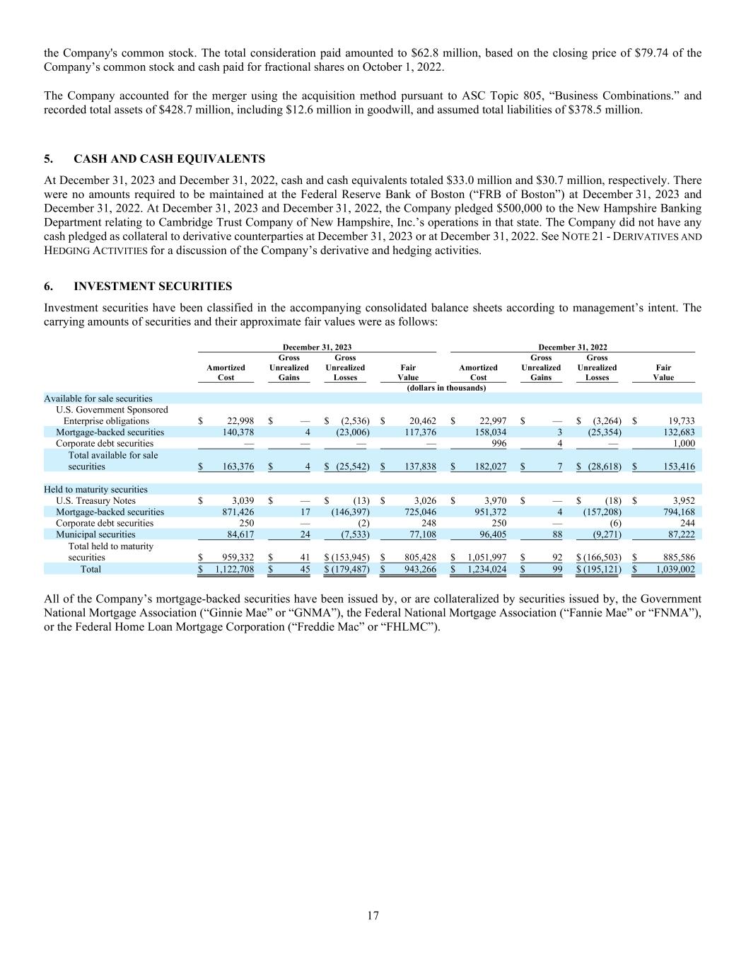 17 the Company's common stock. The total consideration paid amounted to $62.8 million, based on the closing price of $79.74 of the Company’s common stock and cash paid for fractional shares on October 1, 2022. The Company accounted for the merger using the acquisition method pursuant to ASC Topic 805, “Business Combinations.” and recorded total assets of $428.7 million, including $12.6 million in goodwill, and assumed total liabilities of $378.5 million. 5. CASH AND CASH EQUIVALENTS At December 31, 2023 and December 31, 2022, cash and cash equivalents totaled $33.0 million and $30.7 million, respectively. There were no amounts required to be maintained at the Federal Reserve Bank of Boston (“FRB of Boston”) at December 31, 2023 and December 31, 2022. At December 31, 2023 and December 31, 2022, the Company pledged $500,000 to the New Hampshire Banking Department relating to Cambridge Trust Company of New Hampshire, Inc.’s operations in that state. The Company did not have any cash pledged as collateral to derivative counterparties at December 31, 2023 or at December 31, 2022. See NOTE 21 - DERIVATIVES AND HEDGING ACTIVITIES for a discussion of the Company’s derivative and hedging activities. 6. INVESTMENT SECURITIES Investment securities have been classified in the accompanying consolidated balance sheets according to management’s intent. The carrying amounts of securities and their approximate fair values were as follows: December 31, 2023 December 31, 2022 Amortized Cost Gross Unrealized Gains Gross Unrealized Losses Fair Value Amortized Cost Gross Unrealized Gains Gross Unrealized Losses Fair Value (dollars in thousands) Available for sale securities U.S. Government Sponsored Enterprise obligations $ 22,998 $ — $ (2,536) $ 20,462 $ 22,997 $ — $ (3,264) $ 19,733 Mortgage-backed securities 140,378 4 (23,006) 117,376 158,034 3 (25,354) 132,683 Corporate debt securities — — — — 996 4 — 1,000 Total available for sale securities $ 163,376 $ 4 $ (25,542) $ 137,838 $ 182,027 $ 7 $ (28,618) $ 153,416 Held to maturity securities U.S. Treasury Notes $ 3,039 $ — $ (13) $ 3,026 $ 3,970 $ — $ (18) $ 3,952 Mortgage-backed securities 871,426 17 (146,397) 725,046 951,372 4 (157,208) 794,168 Corporate debt securities 250 — (2) 248 250 — (6) 244 Municipal securities 84,617 24 (7,533) 77,108 96,405 88 (9,271) 87,222 Total held to maturity securities $ 959,332 $ 41 $ (153,945) $ 805,428 $ 1,051,997 $ 92 $ (166,503) $ 885,586 Total $ 1,122,708 $ 45 $ (179,487) $ 943,266 $ 1,234,024 $ 99 $ (195,121) $ 1,039,002 All of the Company’s mortgage-backed securities have been issued by, or are collateralized by securities issued by, the Government National Mortgage Association (“Ginnie Mae” or “GNMA”), the Federal National Mortgage Association (“Fannie Mae” or “FNMA”), or the Federal Home Loan Mortgage Corporation (“Freddie Mac” or “FHLMC”).