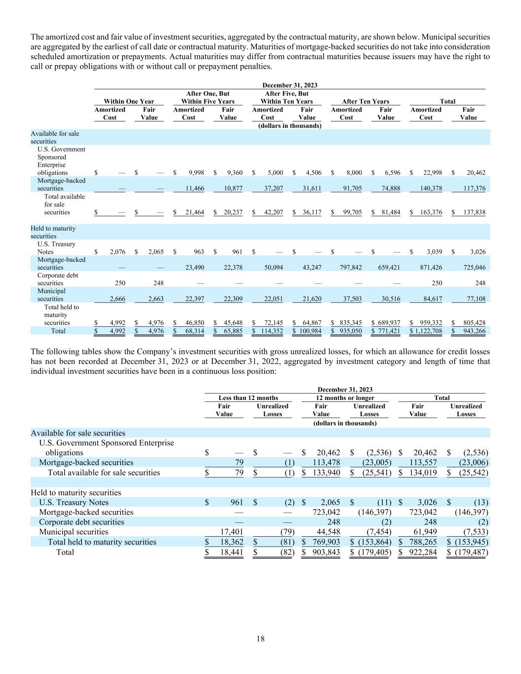 18 The amortized cost and fair value of investment securities, aggregated by the contractual maturity, are shown below. Municipal securities are aggregated by the earliest of call date or contractual maturity. Maturities of mortgage-backed securities do not take into consideration scheduled amortization or prepayments. Actual maturities may differ from contractual maturities because issuers may have the right to call or prepay obligations with or without call or prepayment penalties. December 31, 2023 Within One Year After One, But Within Five Years After Five, But Within Ten Years After Ten Years Total Amortized Cost Fair Value Amortized Cost Fair Value Amortized Cost Fair Value Amortized Cost Fair Value Amortized Cost Fair Value (dollars in thousands) Available for sale securities U.S. Government Sponsored Enterprise obligations $ — $ — $ 9,998 $ 9,360 $ 5,000 $ 4,506 $ 8,000 $ 6,596 $ 22,998 $ 20,462 Mortgage-backed securities — — 11,466 10,877 37,207 31,611 91,705 74,888 140,378 117,376 Total available for sale securities $ — $ — $ 21,464 $ 20,237 $ 42,207 $ 36,117 $ 99,705 $ 81,484 $ 163,376 $ 137,838 Held to maturity securities U.S. Treasury Notes $ 2,076 $ 2,065 $ 963 $ 961 $ — $ — $ — $ — $ 3,039 $ 3,026 Mortgage-backed securities — — 23,490 22,378 50,094 43,247 797,842 659,421 871,426 725,046 Corporate debt securities 250 248 — — — — — — 250 248 Municipal securities 2,666 2,663 22,397 22,309 22,051 21,620 37,503 30,516 84,617 77,108 Total held to maturity securities $ 4,992 $ 4,976 $ 46,850 $ 45,648 $ 72,145 $ 64,867 $ 835,345 $ 689,937 $ 959,332 $ 805,428 Total $ 4,992 $ 4,976 $ 68,314 $ 65,885 $ 114,352 $ 100,984 $ 935,050 $ 771,421 $ 1,122,708 $ 943,266 The following tables show the Company’s investment securities with gross unrealized losses, for which an allowance for credit losses has not been recorded at December 31, 2023 or at December 31, 2022, aggregated by investment category and length of time that individual investment securities have been in a continuous loss position: December 31, 2023 Less than 12 months 12 months or longer Total Fair Value Unrealized Losses Fair Value Unrealized Losses Fair Value Unrealized Losses (dollars in thousands) Available for sale securities U.S. Government Sponsored Enterprise obligations $ — $ — $ 20,462 $ (2,536) $ 20,462 $ (2,536 ) Mortgage-backed securities 79 (1) 113,478 (23,005) 113,557 (23,006 ) Total available for sale securities $ 79 $ (1) $ 133,940 $ (25,541) $ 134,019 $ (25,542 ) Held to maturity securities U.S. Treasury Notes $ 961 $ (2) $ 2,065 $ (11) $ 3,026 $ (13 ) Mortgage-backed securities — — 723,042 (146,397) 723,042 (146,397 ) Corporate debt securities — — 248 (2) 248 (2 ) Municipal securities 17,401 (79) 44,548 (7,454) 61,949 (7,533 ) Total held to maturity securities $ 18,362 $ (81) $ 769,903 $ (153,864) $ 788,265 $ (153,945 ) Total $ 18,441 $ (82) $ 903,843 $ (179,405) $ 922,284 $ (179,487 )