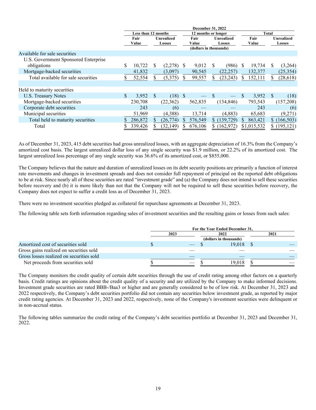 19 December 31, 2022 Less than 12 months 12 months or longer Total Fair Value Unrealized Losses Fair Value Unrealized Losses Fair Value Unrealized Losses (dollars in thousands) Available for sale securities U.S. Government Sponsored Enterprise obligations $ 10,722 $ (2,278) $ 9,012 $ (986) $ 19,734 $ (3,264 ) Mortgage-backed securities 41,832 (3,097) 90,545 (22,257) 132,377 (25,354 ) Total available for sale securities $ 52,554 $ (5,375) $ 99,557 $ (23,243) $ 152,111 $ (28,618 ) Held to maturity securities U.S. Treasury Notes $ 3,952 $ (18) $ — $ — $ 3,952 $ (18 ) Mortgage-backed securities 230,708 (22,362) 562,835 (134,846) 793,543 (157,208 ) Corporate debt securities 243 (6) — — 243 (6 ) Municipal securities 51,969 (4,388) 13,714 (4,883) 65,683 (9,271 ) Total held to maturity securities $ 286,872 $ (26,774) $ 576,549 $ (139,729) $ 863,421 $ (166,503 ) Total $ 339,426 $ (32,149) $ 676,106 $ (162,972) $ 1,015,532 $ (195,121 ) As of December 31, 2023, 415 debt securities had gross unrealized losses, with an aggregate depreciation of 16.3% from the Company’s amortized cost basis. The largest unrealized dollar loss of any single security was $1.9 million, or 22.2% of its amortized cost. The largest unrealized loss percentage of any single security was 36.6% of its amortized cost, or $855,000. The Company believes that the nature and duration of unrealized losses on its debt security positions are primarily a function of interest rate movements and changes in investment spreads and does not consider full repayment of principal on the reported debt obligations to be at risk. Since nearly all of these securities are rated “investment grade” and (a) the Company does not intend to sell these securities before recovery and (b) it is more likely than not that the Company will not be required to sell these securities before recovery, the Company does not expect to suffer a credit loss as of December 31, 2023. There were no investment securities pledged as collateral for repurchase agreements at December 31, 2023. The following table sets forth information regarding sales of investment securities and the resulting gains or losses from such sales: For the Year Ended December 31, 2023 2022 2021 (dollars in thousands) Amortized cost of securities sold $ — $ 19,018 $ — Gross gains realized on securities sold — — — Gross losses realized on securities sold — — — Net proceeds from securities sold $ — $ 19,018 $ — The Company monitors the credit quality of certain debt securities through the use of credit rating among other factors on a quarterly basis. Credit ratings are opinions about the credit quality of a security and are utilized by the Company to make informed decisions. Investment grade securities are rated BBB-/Baa3 or higher and are generally considered to be of low risk. At December 31, 2023 and 2022 respectively, the Company’s debt securities portfolio did not contain any securities below investment grade, as reported by major credit rating agencies. At December 31, 2023 and 2022, respectively, none of the Company's investment securities were delinquent or in non-accrual status. The following tables summarize the credit rating of the Company’s debt securities portfolio at December 31, 2023 and December 31, 2022.