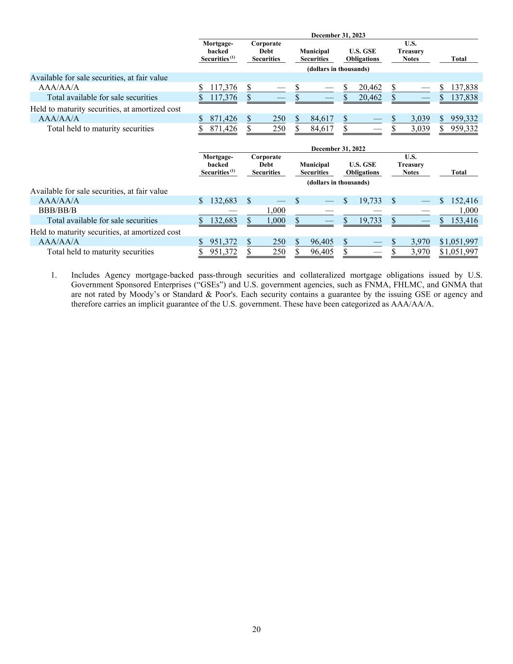 20 December 31, 2023 Mortgage- backed Securities (1) Corporate Debt Securities Municipal Securities U.S. GSE Obligations U.S. Treasury Notes Total (dollars in thousands) Available for sale securities, at fair value AAA/AA/A $ 117,376 $ — $ — $ 20,462 $ — $ 137,838 Total available for sale securities $ 117,376 $ — $ — $ 20,462 $ — $ 137,838 Held to maturity securities, at amortized cost AAA/AA/A $ 871,426 $ 250 $ 84,617 $ — $ 3,039 $ 959,332 Total held to maturity securities $ 871,426 $ 250 $ 84,617 $ — $ 3,039 $ 959,332 December 31, 2022 Mortgage- backed Securities (1) Corporate Debt Securities Municipal Securities U.S. GSE Obligations U.S. Treasury Notes Total (dollars in thousands) Available for sale securities, at fair value AAA/AA/A $ 132,683 $ — $ — $ 19,733 $ — $ 152,416 BBB/BB/B — 1,000 — — — 1,000 Total available for sale securities $ 132,683 $ 1,000 $ — $ 19,733 $ — $ 153,416 Held to maturity securities, at amortized cost AAA/AA/A $ 951,372 $ 250 $ 96,405 $ — $ 3,970 $ 1,051,997 Total held to maturity securities $ 951,372 $ 250 $ 96,405 $ — $ 3,970 $ 1,051,997 1. Includes Agency mortgage-backed pass-through securities and collateralized mortgage obligations issued by U.S. Government Sponsored Enterprises (“GSEs”) and U.S. government agencies, such as FNMA, FHLMC, and GNMA that are not rated by Moody’s or Standard & Poor's. Each security contains a guarantee by the issuing GSE or agency and therefore carries an implicit guarantee of the U.S. government. These have been categorized as AAA/AA/A.