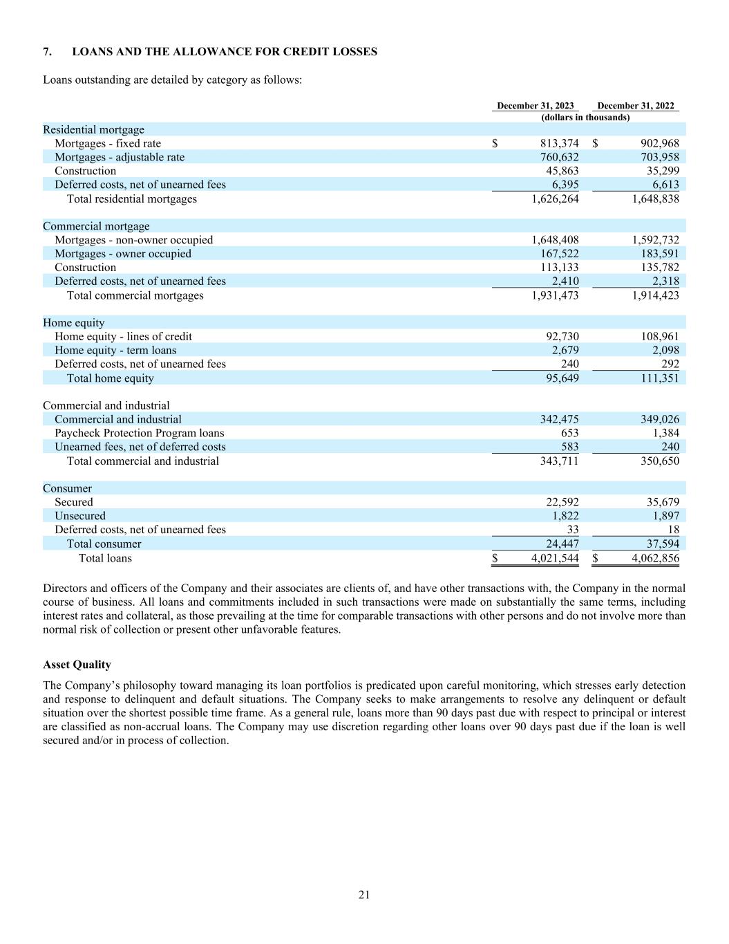 21 7. LOANS AND THE ALLOWANCE FOR CREDIT LOSSES Loans outstanding are detailed by category as follows: December 31, 2023 December 31, 2022 (dollars in thousands) Residential mortgage Mortgages - fixed rate $ 813,374 $ 902,968 Mortgages - adjustable rate 760,632 703,958 Construction 45,863 35,299 Deferred costs, net of unearned fees 6,395 6,613 Total residential mortgages 1,626,264 1,648,838 Commercial mortgage Mortgages - non-owner occupied 1,648,408 1,592,732 Mortgages - owner occupied 167,522 183,591 Construction 113,133 135,782 Deferred costs, net of unearned fees 2,410 2,318 Total commercial mortgages 1,931,473 1,914,423 Home equity Home equity - lines of credit 92,730 108,961 Home equity - term loans 2,679 2,098 Deferred costs, net of unearned fees 240 292 Total home equity 95,649 111,351 Commercial and industrial Commercial and industrial 342,475 349,026 Paycheck Protection Program loans 653 1,384 Unearned fees, net of deferred costs 583 240 Total commercial and industrial 343,711 350,650 Consumer Secured 22,592 35,679 Unsecured 1,822 1,897 Deferred costs, net of unearned fees 33 18 Total consumer 24,447 37,594 Total loans $ 4,021,544 $ 4,062,856 Directors and officers of the Company and their associates are clients of, and have other transactions with, the Company in the normal course of business. All loans and commitments included in such transactions were made on substantially the same terms, including interest rates and collateral, as those prevailing at the time for comparable transactions with other persons and do not involve more than normal risk of collection or present other unfavorable features. Asset Quality The Company’s philosophy toward managing its loan portfolios is predicated upon careful monitoring, which stresses early detection and response to delinquent and default situations. The Company seeks to make arrangements to resolve any delinquent or default situation over the shortest possible time frame. As a general rule, loans more than 90 days past due with respect to principal or interest are classified as non-accrual loans. The Company may use discretion regarding other loans over 90 days past due if the loan is well secured and/or in process of collection.