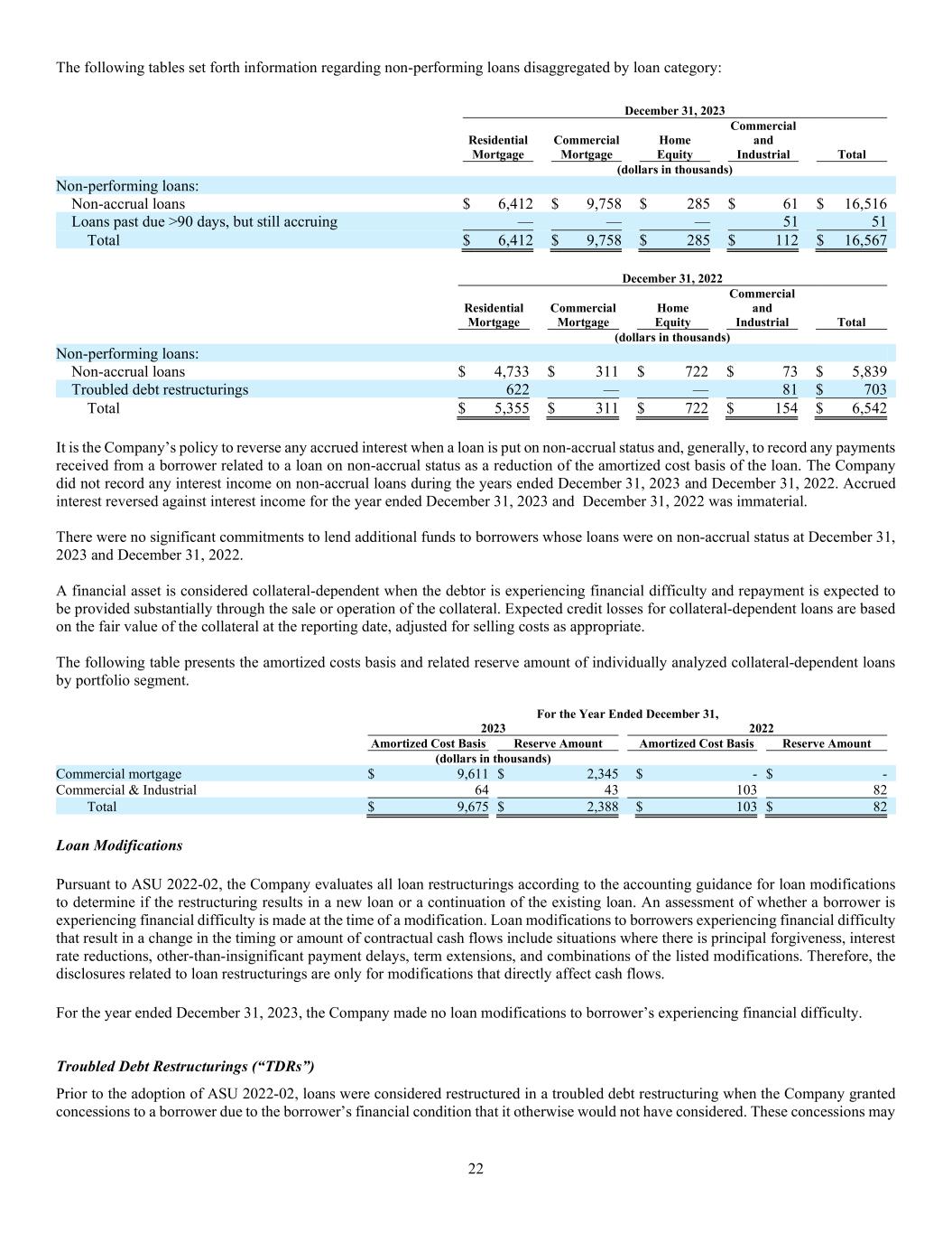 22 The following tables set forth information regarding non-performing loans disaggregated by loan category: December 31, 2023 Residential Mortgage Commercial Mortgage Home Equity Commercial and Industrial Total (dollars in thousands) Non-performing loans: Non-accrual loans $ 6,412 $ 9,758 $ 285 $ 61 $ 16,516 Loans past due >90 days, but still accruing — — — 51 51 Total $ 6,412 $ 9,758 $ 285 $ 112 $ 16,567 December 31, 2022 Residential Mortgage Commercial Mortgage Home Equity Commercial and Industrial Total (dollars in thousands) Non-performing loans: Non-accrual loans $ 4,733 $ 311 $ 722 $ 73 $ 5,839 Troubled debt restructurings 622 — — 81 $ 703 Total $ 5,355 $ 311 $ 722 $ 154 $ 6,542 It is the Company’s policy to reverse any accrued interest when a loan is put on non-accrual status and, generally, to record any payments received from a borrower related to a loan on non-accrual status as a reduction of the amortized cost basis of the loan. The Company did not record any interest income on non-accrual loans during the years ended December 31, 2023 and December 31, 2022. Accrued interest reversed against interest income for the year ended December 31, 2023 and December 31, 2022 was immaterial. There were no significant commitments to lend additional funds to borrowers whose loans were on non-accrual status at December 31, 2023 and December 31, 2022. A financial asset is considered collateral-dependent when the debtor is experiencing financial difficulty and repayment is expected to be provided substantially through the sale or operation of the collateral. Expected credit losses for collateral-dependent loans are based on the fair value of the collateral at the reporting date, adjusted for selling costs as appropriate. The following table presents the amortized costs basis and related reserve amount of individually analyzed collateral-dependent loans by portfolio segment. For the Year Ended December 31, 2023 2022 Amortized Cost Basis Reserve Amount Amortized Cost Basis Reserve Amount (dollars in thousands) Commercial mortgage $ 9,611 $ 2,345 $ - $ - Commercial & Industrial 64 43 103 82 Total $ 9,675 $ 2,388 $ 103 $ 82 Loan Modifications Pursuant to ASU 2022-02, the Company evaluates all loan restructurings according to the accounting guidance for loan modifications to determine if the restructuring results in a new loan or a continuation of the existing loan. An assessment of whether a borrower is experiencing financial difficulty is made at the time of a modification. Loan modifications to borrowers experiencing financial difficulty that result in a change in the timing or amount of contractual cash flows include situations where there is principal forgiveness, interest rate reductions, other-than-insignificant payment delays, term extensions, and combinations of the listed modifications. Therefore, the disclosures related to loan restructurings are only for modifications that directly affect cash flows. For the year ended December 31, 2023, the Company made no loan modifications to borrower’s experiencing financial difficulty. Troubled Debt Restructurings (“TDRs”) Prior to the adoption of ASU 2022-02, loans were considered restructured in a troubled debt restructuring when the Company granted concessions to a borrower due to the borrower’s financial condition that it otherwise would not have considered. These concessions may