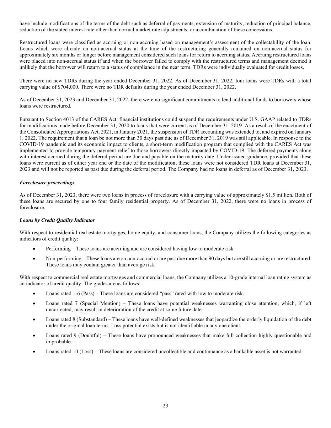 23 have include modifications of the terms of the debt such as deferral of payments, extension of maturity, reduction of principal balance, reduction of the stated interest rate other than normal market rate adjustments, or a combination of these concessions. Restructured loans were classified as accruing or non-accruing based on management’s assessment of the collectability of the loan. Loans which were already on non-accrual status at the time of the restructuring generally remained on non-accrual status for approximately six months or longer before management considered such loans for return to accruing status. Accruing restructured loans were placed into non-accrual status if and when the borrower failed to comply with the restructured terms and management deemed it unlikely that the borrower will return to a status of compliance in the near term. TDRs were individually evaluated for credit losses. There were no new TDRs during the year ended December 31, 2022. As of December 31, 2022, four loans were TDRs with a total carrying value of $704,000. There were no TDR defaults during the year ended December 31, 2022. As of December 31, 2023 and December 31, 2022, there were no significant commitments to lend additional funds to borrowers whose loans were restructured. Pursuant to Section 4013 of the CARES Act, financial institutions could suspend the requirements under U.S. GAAP related to TDRs for modifications made before December 31, 2020 to loans that were current as of December 31, 2019. As a result of the enactment of the Consolidated Appropriations Act, 2021, in January 2021, the suspension of TDR accounting was extended to, and expired on January 1, 2022. The requirement that a loan be not more than 30 days past due as of December 31, 2019 was still applicable. In response to the COVID-19 pandemic and its economic impact to clients, a short-term modification program that complied with the CARES Act was implemented to provide temporary payment relief to those borrowers directly impacted by COVID-19. The deferred payments along with interest accrued during the deferral period are due and payable on the maturity date. Under issued guidance, provided that these loans were current as of either year end or the date of the modification, these loans were not considered TDR loans at December 31, 2023 and will not be reported as past due during the deferral period. The Company had no loans in deferral as of December 31, 2023. Foreclosure proceedings As of December 31, 2023, there were two loans in process of foreclosure with a carrying value of approximately $1.5 million. Both of these loans are secured by one to four family residential property. As of December 31, 2022, there were no loans in process of foreclosure. Loans by Credit Quality Indicator With respect to residential real estate mortgages, home equity, and consumer loans, the Company utilizes the following categories as indicators of credit quality:  Performing – These loans are accruing and are considered having low to moderate risk.  Non-performing – These loans are on non-accrual or are past due more than 90 days but are still accruing or are restructured. These loans may contain greater than average risk. With respect to commercial real estate mortgages and commercial loans, the Company utilizes a 10-grade internal loan rating system as an indicator of credit quality. The grades are as follows:  Loans rated 1-6 (Pass) – These loans are considered “pass” rated with low to moderate risk.  Loans rated 7 (Special Mention) – These loans have potential weaknesses warranting close attention, which, if left uncorrected, may result in deterioration of the credit at some future date.  Loans rated 8 (Substandard) – These loans have well-defined weaknesses that jeopardize the orderly liquidation of the debt under the original loan terms. Loss potential exists but is not identifiable in any one client.  Loans rated 9 (Doubtful) – These loans have pronounced weaknesses that make full collection highly questionable and improbable.  Loans rated 10 (Loss) – These loans are considered uncollectible and continuance as a bankable asset is not warranted.