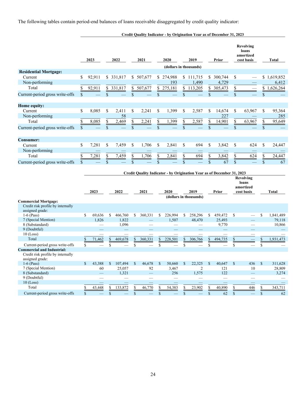 24 The following tables contain period-end balances of loans receivable disaggregated by credit quality indicator: Credit Quality Indicator - by Origination Year as of December 31, 2023 2023 2022 2021 2020 2019 Prior Revolving loans amortized cost basis Total (dollars in thousands) Residential Mortgage: Current $ 92,911 $ 331,817 $ 507,677 $ 274,988 $ 111,715 $ 300,744 $ — $ 1,619,852 Non-performing 193 1,490 4,729 — 6,412 Total $ 92,911 $ 331,817 $ 507,677 $ 275,181 $ 113,205 $ 305,473 $ — $ 1,626,264 Current-period gross write-offs $ — $ — $ — $ — $ — $ — $ — $ — Home equity: Current $ 8,085 $ 2,411 $ 2,241 $ 1,399 $ 2,587 $ 14,674 $ 63,967 $ 95,364 Non-performing 58 227 — 285 Total $ 8,085 $ 2,469 $ 2,241 $ 1,399 $ 2,587 $ 14,901 $ 63,967 $ 95,649 Current-period gross write-offs $ — $ — $ — $ — $ — $ — $ — $ — Consumer: Current $ 7,281 $ 7,459 $ 1,706 $ 2,841 $ 694 $ 3,842 $ 624 $ 24,447 Non-performing — — — — — — — — Total $ 7,281 $ 7,459 $ 1,706 $ 2,841 $ 694 $ 3,842 $ 624 $ 24,447 Current-period gross write-offs $ — $ — $ — $ — $ — $ 67 $ — $ 67 Credit Quality Indicator - by Origination Year as of December 31, 2023 2023 2022 2021 2020 2019 Prior Revolving loans amortized cost basis Total (dollars in thousands) Commercial Mortgage: Credit risk profile by internally assigned grade: 1-6 (Pass) $ 69,636 $ 466,760 $ 360,331 $ 226,994 $ 258,296 $ 459,472 $ — $ 1,841,489 7 (Special Mention) 1,826 1,822 — 1,507 48,470 25,493 — 79,118 8 (Substandard) — 1,096 — — — 9,770 — 10,866 9 (Doubtful) — — — — — — — — 10 (Loss) — — — — — — — — Total $ 71,462 $ 469,678 $ 360,331 $ 228,501 $ 306,766 $ 494,735 $ — $ 1,931,473 Current-period gross write-offs $ — $ — $ — $ — $ — $ — $ — $ — Commercial and Industrial: Credit risk profile by internally assigned grade: 1-6 (Pass) $ 43,388 $ 107,494 $ 46,678 $ 50,660 $ 22,325 $ 40,647 $ 436 $ 311,628 7 (Special Mention) 60 25,057 92 3,467 2 121 10 28,809 8 (Substandard) — 1,321 — 256 1,575 122 — 3,274 9 (Doubtful) — — — — — — — — 10 (Loss) — — — — — — — — Total $ 43,448 $ 133,872 $ 46,770 $ 54,383 $ 23,902 $ 40,890 $ 446 $ 343,711 Current-period gross write-offs $ — $ — $ — $ — $ — $ 62 $ — $ 62