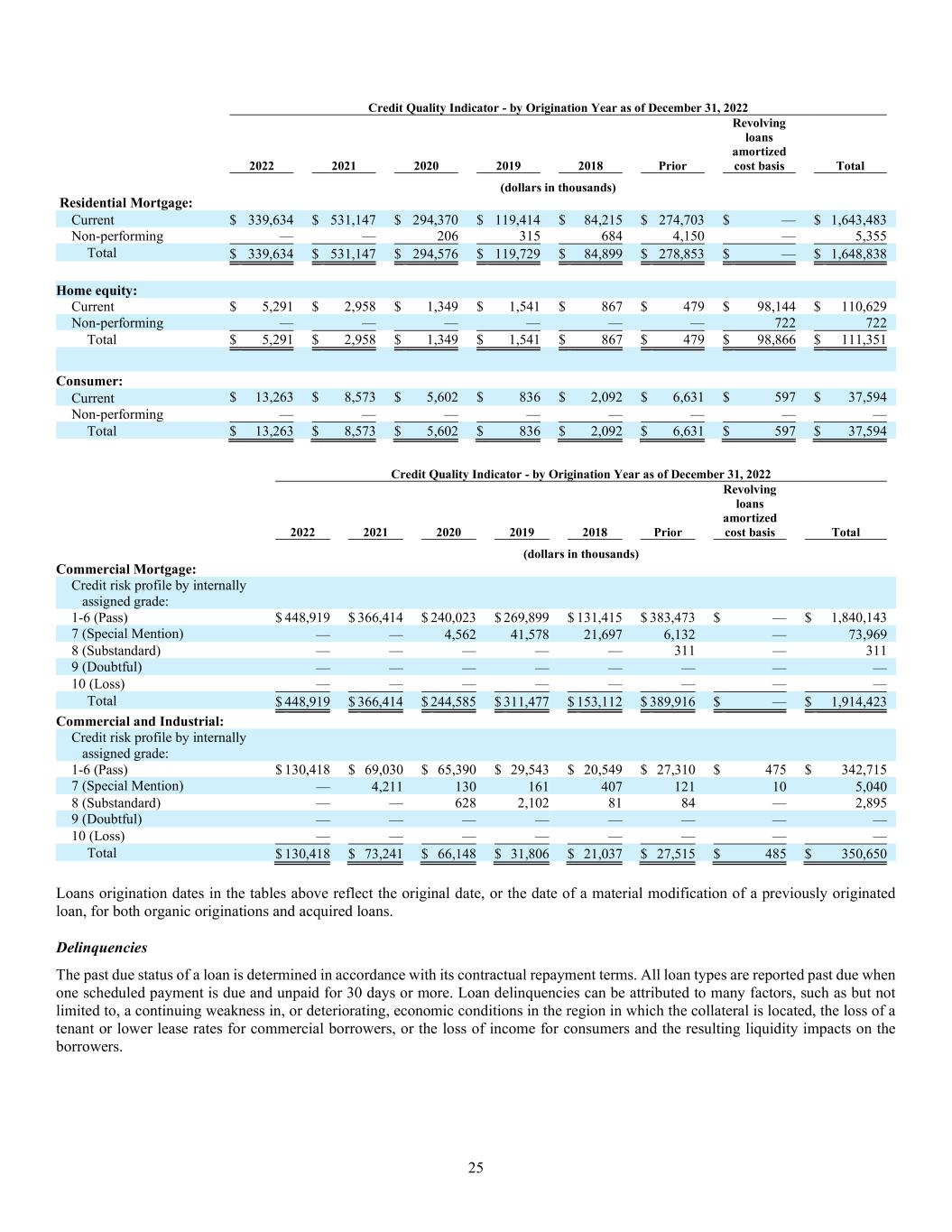 25 Credit Quality Indicator - by Origination Year as of December 31, 2022 2022 2021 2020 2019 2018 Prior Revolving loans amortized cost basis Total (dollars in thousands) Residential Mortgage: Current $ 339,634 $ 531,147 $ 294,370 $ 119,414 $ 84,215 $ 274,703 $ — $ 1,643,483 Non-performing — — 206 315 684 4,150 — 5,355 Total $ 339,634 $ 531,147 $ 294,576 $ 119,729 $ 84,899 $ 278,853 $ — $ 1,648,838 Home equity: Current $ 5,291 $ 2,958 $ 1,349 $ 1,541 $ 867 $ 479 $ 98,144 $ 110,629 Non-performing — — — — — — 722 722 Total $ 5,291 $ 2,958 $ 1,349 $ 1,541 $ 867 $ 479 $ 98,866 $ 111,351 Consumer: Current $ 13,263 $ 8,573 $ 5,602 $ 836 $ 2,092 $ 6,631 $ 597 $ 37,594 Non-performing — — — — — — — — Total $ 13,263 $ 8,573 $ 5,602 $ 836 $ 2,092 $ 6,631 $ 597 $ 37,594 Credit Quality Indicator - by Origination Year as of December 31, 2022 2022 2021 2020 2019 2018 Prior Revolving loans amortized cost basis Total (dollars in thousands) Commercial Mortgage: Credit risk profile by internally assigned grade: 1-6 (Pass) $ 448,919 $ 366,414 $ 240,023 $ 269,899 $ 131,415 $ 383,473 $ — $ 1,840,143 7 (Special Mention) — — 4,562 41,578 21,697 6,132 — 73,969 8 (Substandard) — — — — — 311 — 311 9 (Doubtful) — — — — — — — — 10 (Loss) — — — — — — — — Total $ 448,919 $ 366,414 $ 244,585 $ 311,477 $ 153,112 $ 389,916 $ — $ 1,914,423 Commercial and Industrial: Credit risk profile by internally assigned grade: 1-6 (Pass) $ 130,418 $ 69,030 $ 65,390 $ 29,543 $ 20,549 $ 27,310 $ 475 $ 342,715 7 (Special Mention) — 4,211 130 161 407 121 10 5,040 8 (Substandard) — — 628 2,102 81 84 — 2,895 9 (Doubtful) — — — — — — — — 10 (Loss) — — — — — — — — Total $ 130,418 $ 73,241 $ 66,148 $ 31,806 $ 21,037 $ 27,515 $ 485 $ 350,650 Loans origination dates in the tables above reflect the original date, or the date of a material modification of a previously originated loan, for both organic originations and acquired loans. Delinquencies The past due status of a loan is determined in accordance with its contractual repayment terms. All loan types are reported past due when one scheduled payment is due and unpaid for 30 days or more. Loan delinquencies can be attributed to many factors, such as but not limited to, a continuing weakness in, or deteriorating, economic conditions in the region in which the collateral is located, the loss of a tenant or lower lease rates for commercial borrowers, or the loss of income for consumers and the resulting liquidity impacts on the borrowers.