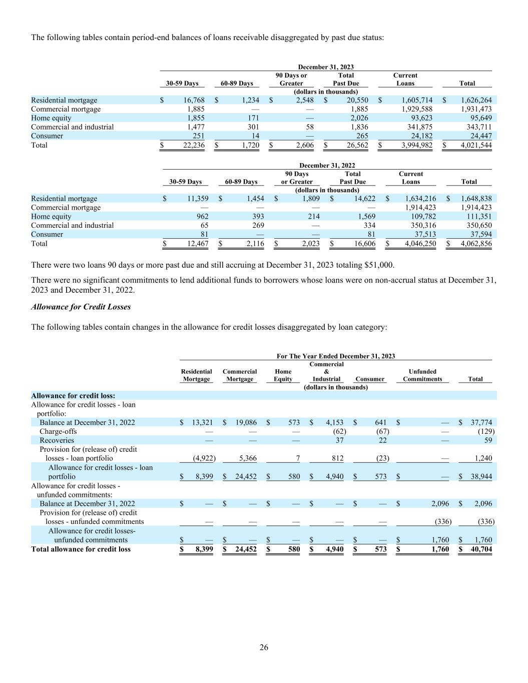 26 The following tables contain period-end balances of loans receivable disaggregated by past due status: December 31, 2023 30-59 Days 60-89 Days 90 Days or Greater Total Past Due Current Loans Total (dollars in thousands) Residential mortgage $ 16,768 $ 1,234 $ 2,548 $ 20,550 $ 1,605,714 $ 1,626,264 Commercial mortgage 1,885 — — 1,885 1,929,588 1,931,473 Home equity 1,855 171 — 2,026 93,623 95,649 Commercial and industrial 1,477 301 58 1,836 341,875 343,711 Consumer 251 14 — 265 24,182 24,447 Total $ 22,236 $ 1,720 $ 2,606 $ 26,562 $ 3,994,982 $ 4,021,544 December 31, 2022 30-59 Days 60-89 Days 90 Days or Greater Total Past Due Current Loans Total (dollars in thousands) Residential mortgage $ 11,359 $ 1,454 $ 1,809 $ 14,622 $ 1,634,216 $ 1,648,838 Commercial mortgage — — — — 1,914,423 1,914,423 Home equity 962 393 214 1,569 109,782 111,351 Commercial and industrial 65 269 — 334 350,316 350,650 Consumer 81 — — 81 37,513 37,594 Total $ 12,467 $ 2,116 $ 2,023 $ 16,606 $ 4,046,250 $ 4,062,856 There were two loans 90 days or more past due and still accruing at December 31, 2023 totaling $51,000. There were no significant commitments to lend additional funds to borrowers whose loans were on non-accrual status at December 31, 2023 and December 31, 2022. Allowance for Credit Losses The following tables contain changes in the allowance for credit losses disaggregated by loan category: For The Year Ended December 31, 2023 Residential Mortgage Commercial Mortgage Home Equity Commercial & Industrial Consumer Unfunded Commitments Total (dollars in thousands) Allowance for credit loss: Allowance for credit losses - loan portfolio: Balance at December 31, 2022 $ 13,321 $ 19,086 $ 573 $ 4,153 $ 641 $ — $ 37,774 Charge-offs — — — (62 ) (67) — (129) Recoveries — — — 37 22 — 59 Provision for (release of) credit losses - loan portfolio (4,922) 5,366 7 812 (23) — 1,240 Allowance for credit losses - loan portfolio $ 8,399 $ 24,452 $ 580 $ 4,940 $ 573 $ — $ 38,944 Allowance for credit losses - unfunded commitments: Balance at December 31, 2022 $ — $ — $ — $ — $ — $ 2,096 $ 2,096 Provision for (release of) credit losses - unfunded commitments — — — — — (336) (336) Allowance for credit losses- unfunded commitments $ — $ — $ — $ — $ — $ 1,760 $ 1,760 Total allowance for credit loss $ 8,399 $ 24,452 $ 580 $ 4,940 $ 573 $ 1,760 $ 40,704