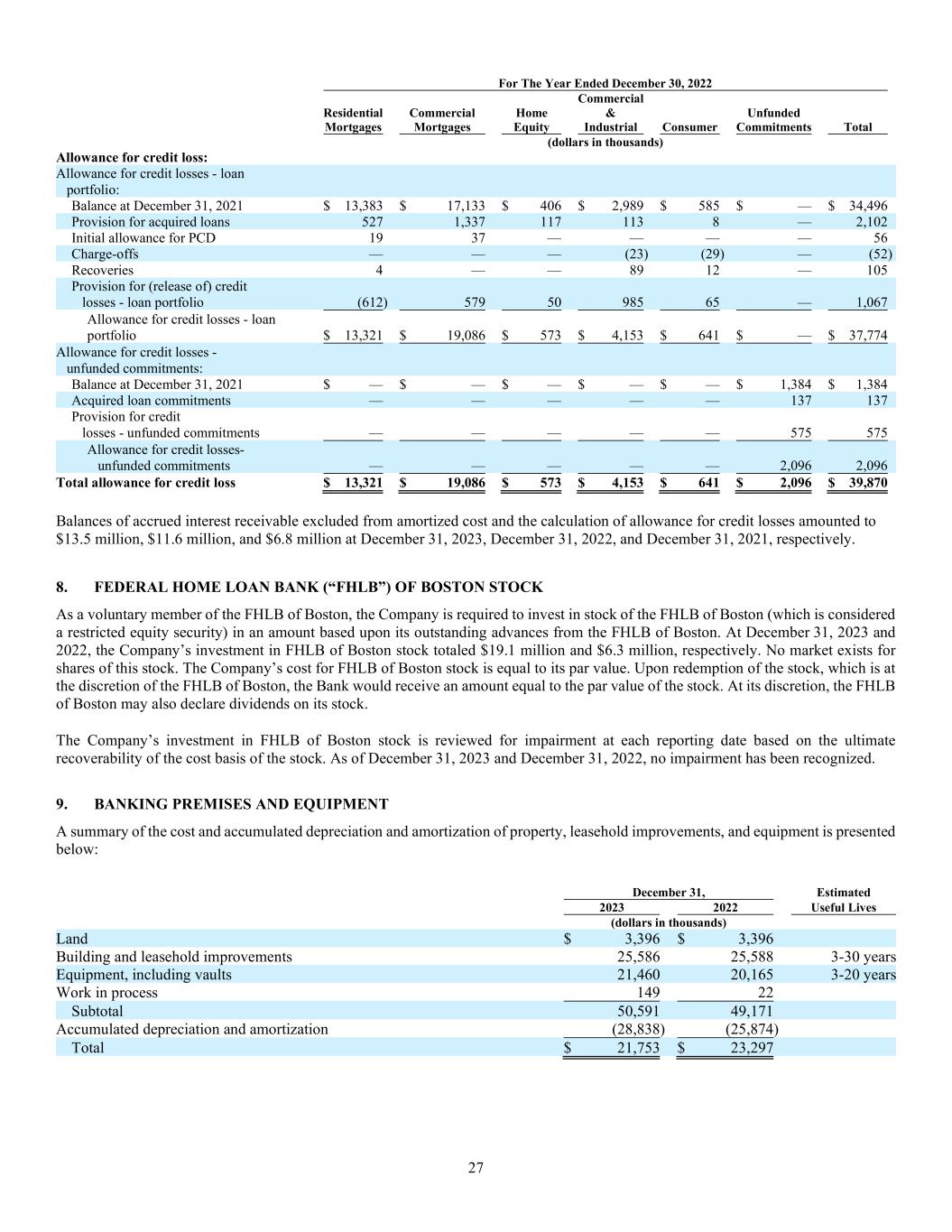 27 For The Year Ended December 30, 2022 Residential Mortgages Commercial Mortgages Home Equity Commercial & Industrial Consumer Unfunded Commitments Total (dollars in thousands) Allowance for credit loss: Allowance for credit losses - loan portfolio: Balance at December 31, 2021 $ 13,383 $ 17,133 $ 406 $ 2,989 $ 585 $ — $ 34,496 Provision for acquired loans 527 1,337 117 113 8 — 2,102 Initial allowance for PCD 19 37 — — — — 56 Charge-offs — — — (23) (29 ) — (52 ) Recoveries 4 — — 89 12 — 105 Provision for (release of) credit losses - loan portfolio (612) 579 50 985 65 — 1,067 Allowance for credit losses - loan portfolio $ 13,321 $ 19,086 $ 573 $ 4,153 $ 641 $ — $ 37,774 Allowance for credit losses - unfunded commitments: Balance at December 31, 2021 $ — $ — $ — $ — $ — $ 1,384 $ 1,384 Acquired loan commitments — — — — — 137 137 Provision for credit losses - unfunded commitments — — — — — 575 575 Allowance for credit losses- unfunded commitments — — — — — 2,096 2,096 Total allowance for credit loss $ 13,321 $ 19,086 $ 573 $ 4,153 $ 641 $ 2,096 $ 39,870 Balances of accrued interest receivable excluded from amortized cost and the calculation of allowance for credit losses amounted to $13.5 million, $11.6 million, and $6.8 million at December 31, 2023, December 31, 2022, and December 31, 2021, respectively. 8. FEDERAL HOME LOAN BANK (“FHLB”) OF BOSTON STOCK As a voluntary member of the FHLB of Boston, the Company is required to invest in stock of the FHLB of Boston (which is considered a restricted equity security) in an amount based upon its outstanding advances from the FHLB of Boston. At December 31, 2023 and 2022, the Company’s investment in FHLB of Boston stock totaled $19.1 million and $6.3 million, respectively. No market exists for shares of this stock. The Company’s cost for FHLB of Boston stock is equal to its par value. Upon redemption of the stock, which is at the discretion of the FHLB of Boston, the Bank would receive an amount equal to the par value of the stock. At its discretion, the FHLB of Boston may also declare dividends on its stock. The Company’s investment in FHLB of Boston stock is reviewed for impairment at each reporting date based on the ultimate recoverability of the cost basis of the stock. As of December 31, 2023 and December 31, 2022, no impairment has been recognized. 9. BANKING PREMISES AND EQUIPMENT A summary of the cost and accumulated depreciation and amortization of property, leasehold improvements, and equipment is presented below: December 31, Estimated 2023 2022 Useful Lives (dollars in thousands) Land $ 3,396 $ 3,396 Building and leasehold improvements 25,586 25,588 3-30 years Equipment, including vaults 21,460 20,165 3-20 years Work in process 149 22 Subtotal 50,591 49,171 Accumulated depreciation and amortization (28,838) (25,874) Total $ 21,753 $ 23,297