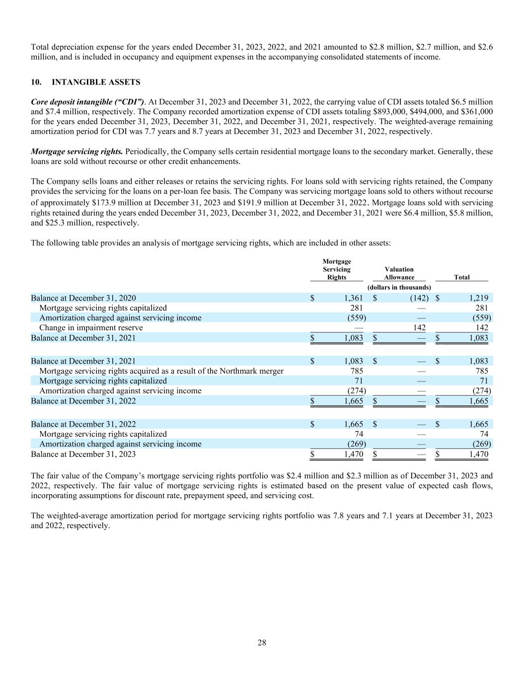 28 Total depreciation expense for the years ended December 31, 2023, 2022, and 2021 amounted to $2.8 million, $2.7 million, and $2.6 million, and is included in occupancy and equipment expenses in the accompanying consolidated statements of income. 10. INTANGIBLE ASSETS Core deposit intangible (“CDI”). At December 31, 2023 and December 31, 2022, the carrying value of CDI assets totaled $6.5 million and $7.4 million, respectively. The Company recorded amortization expense of CDI assets totaling $893,000, $494,000, and $361,000 for the years ended December 31, 2023, December 31, 2022, and December 31, 2021, respectively. The weighted-average remaining amortization period for CDI was 7.7 years and 8.7 years at December 31, 2023 and December 31, 2022, respectively. Mortgage servicing rights. Periodically, the Company sells certain residential mortgage loans to the secondary market. Generally, these loans are sold without recourse or other credit enhancements. The Company sells loans and either releases or retains the servicing rights. For loans sold with servicing rights retained, the Company provides the servicing for the loans on a per-loan fee basis. The Company was servicing mortgage loans sold to others without recourse of approximately $173.9 million at December 31, 2023 and $191.9 million at December 31, 2022. Mortgage loans sold with servicing rights retained during the years ended December 31, 2023, December 31, 2022, and December 31, 2021 were $6.4 million, $5.8 million, and $25.3 million, respectively. The following table provides an analysis of mortgage servicing rights, which are included in other assets: Mortgage Servicing Rights Valuation Allowance Total (dollars in thousands) Balance at December 31, 2020 $ 1,361 $ (142) $ 1,219 Mortgage servicing rights capitalized 281 — 281 Amortization charged against servicing income (559) — (559) Change in impairment reserve — 142 142 Balance at December 31, 2021 $ 1,083 $ — $ 1,083 Balance at December 31, 2021 $ 1,083 $ — $ 1,083 Mortgage servicing rights acquired as a result of the Northmark merger 785 — 785 Mortgage servicing rights capitalized 71 — 71 Amortization charged against servicing income (274) — (274) Balance at December 31, 2022 $ 1,665 $ — $ 1,665 Balance at December 31, 2022 $ 1,665 $ — $ 1,665 Mortgage servicing rights capitalized 74 — 74 Amortization charged against servicing income (269) — (269) Balance at December 31, 2023 $ 1,470 $ — $ 1,470 The fair value of the Company’s mortgage servicing rights portfolio was $2.4 million and $2.3 million as of December 31, 2023 and 2022, respectively. The fair value of mortgage servicing rights is estimated based on the present value of expected cash flows, incorporating assumptions for discount rate, prepayment speed, and servicing cost. The weighted-average amortization period for mortgage servicing rights portfolio was 7.8 years and 7.1 years at December 31, 2023 and 2022, respectively.