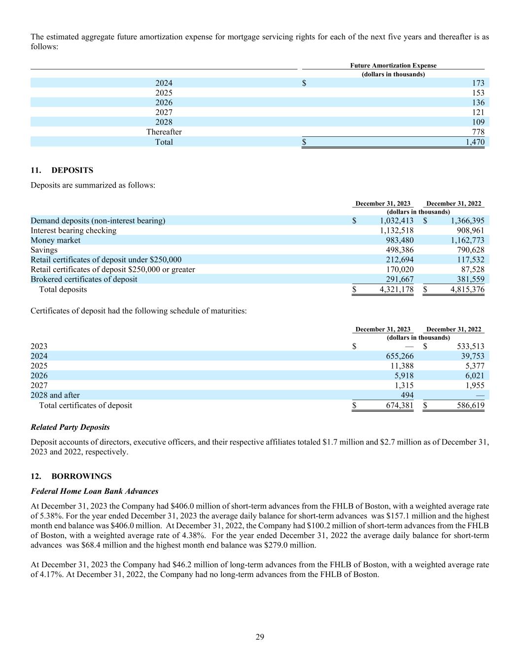 29 The estimated aggregate future amortization expense for mortgage servicing rights for each of the next five years and thereafter is as follows: Future Amortization Expense (dollars in thousands) 2024 $ 173 2025 153 2026 136 2027 121 2028 109 Thereafter 778 Total $ 1,470 11. DEPOSITS Deposits are summarized as follows: December 31, 2023 December 31, 2022 (dollars in thousands) Demand deposits (non-interest bearing) $ 1,032,413 $ 1,366,395 Interest bearing checking 1,132,518 908,961 Money market 983,480 1,162,773 Savings 498,386 790,628 Retail certificates of deposit under $250,000 212,694 117,532 Retail certificates of deposit $250,000 or greater 170,020 87,528 Brokered certificates of deposit 291,667 381,559 Total deposits $ 4,321,178 $ 4,815,376 Certificates of deposit had the following schedule of maturities: December 31, 2023 December 31, 2022 (dollars in thousands) 2023 $ — $ 533,513 2024 655,266 39,753 2025 11,388 5,377 2026 5,918 6,021 2027 1,315 1,955 2028 and after 494 — Total certificates of deposit $ 674,381 $ 586,619 Related Party Deposits Deposit accounts of directors, executive officers, and their respective affiliates totaled $1.7 million and $2.7 million as of December 31, 2023 and 2022, respectively. 12. BORROWINGS Federal Home Loan Bank Advances At December 31, 2023 the Company had $406.0 million of short-term advances from the FHLB of Boston, with a weighted average rate of 5.38%. For the year ended December 31, 2023 the average daily balance for short-term advances was $157.1 million and the highest month end balance was $406.0 million. At December 31, 2022, the Company had $100.2 million of short-term advances from the FHLB of Boston, with a weighted average rate of 4.38%. For the year ended December 31, 2022 the average daily balance for short-term advances was $68.4 million and the highest month end balance was $279.0 million. At December 31, 2023 the Company had $46.2 million of long-term advances from the FHLB of Boston, with a weighted average rate of 4.17%. At December 31, 2022, the Company had no long-term advances from the FHLB of Boston.