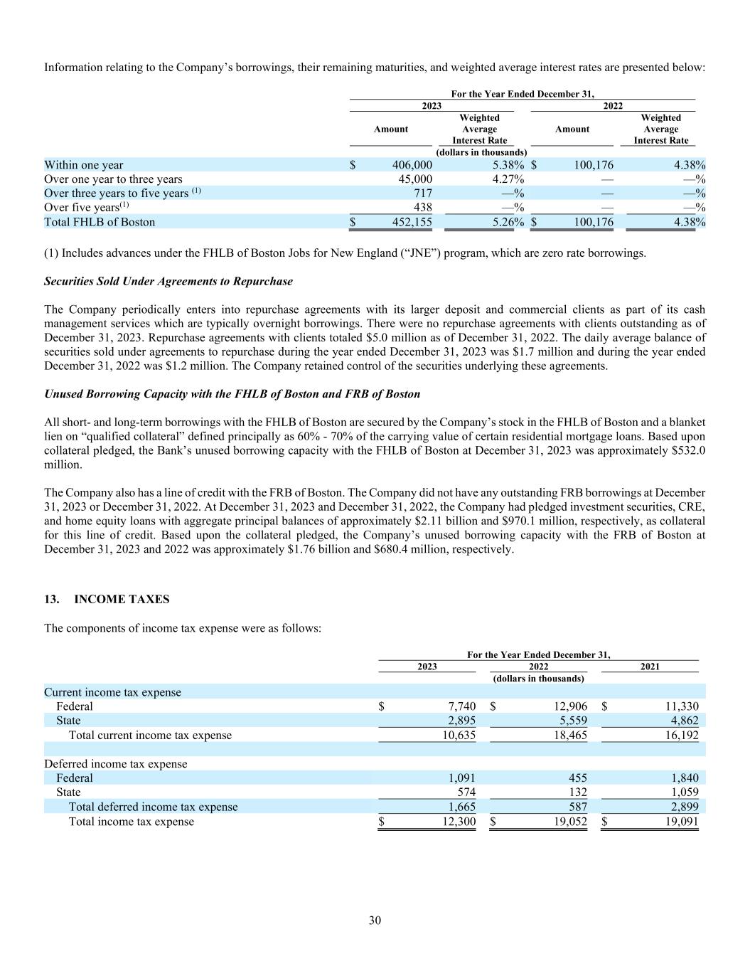 30 Information relating to the Company’s borrowings, their remaining maturities, and weighted average interest rates are presented below: For the Year Ended December 31, 2023 2022 Amount Weighted Average Interest Rate Amount Weighted Average Interest Rate (dollars in thousands) Within one year $ 406,000 5.38% $ 100,176 4.38% Over one year to three years 45,000 4.27% — —% Over three years to five years (1) 717 —% — —% Over five years(1) 438 —% — —% Total FHLB of Boston $ 452,155 5.26% $ 100,176 4.38% (1) Includes advances under the FHLB of Boston Jobs for New England (“JNE”) program, which are zero rate borrowings. Securities Sold Under Agreements to Repurchase The Company periodically enters into repurchase agreements with its larger deposit and commercial clients as part of its cash management services which are typically overnight borrowings. There were no repurchase agreements with clients outstanding as of December 31, 2023. Repurchase agreements with clients totaled $5.0 million as of December 31, 2022. The daily average balance of securities sold under agreements to repurchase during the year ended December 31, 2023 was $1.7 million and during the year ended December 31, 2022 was $1.2 million. The Company retained control of the securities underlying these agreements. Unused Borrowing Capacity with the FHLB of Boston and FRB of Boston All short- and long-term borrowings with the FHLB of Boston are secured by the Company’s stock in the FHLB of Boston and a blanket lien on “qualified collateral” defined principally as 60% - 70% of the carrying value of certain residential mortgage loans. Based upon collateral pledged, the Bank’s unused borrowing capacity with the FHLB of Boston at December 31, 2023 was approximately $532.0 million. The Company also has a line of credit with the FRB of Boston. The Company did not have any outstanding FRB borrowings at December 31, 2023 or December 31, 2022. At December 31, 2023 and December 31, 2022, the Company had pledged investment securities, CRE, and home equity loans with aggregate principal balances of approximately $2.11 billion and $970.1 million, respectively, as collateral for this line of credit. Based upon the collateral pledged, the Company’s unused borrowing capacity with the FRB of Boston at December 31, 2023 and 2022 was approximately $1.76 billion and $680.4 million, respectively. 13. INCOME TAXES The components of income tax expense were as follows: For the Year Ended December 31, 2023 2022 2021 (dollars in thousands) Current income tax expense Federal $ 7,740 $ 12,906 $ 11,330 State 2,895 5,559 4,862 Total current income tax expense 10,635 18,465 16,192 Deferred income tax expense Federal 1,091 455 1,840 State 574 132 1,059 Total deferred income tax expense 1,665 587 2,899 Total income tax expense $ 12,300 $ 19,052 $ 19,091