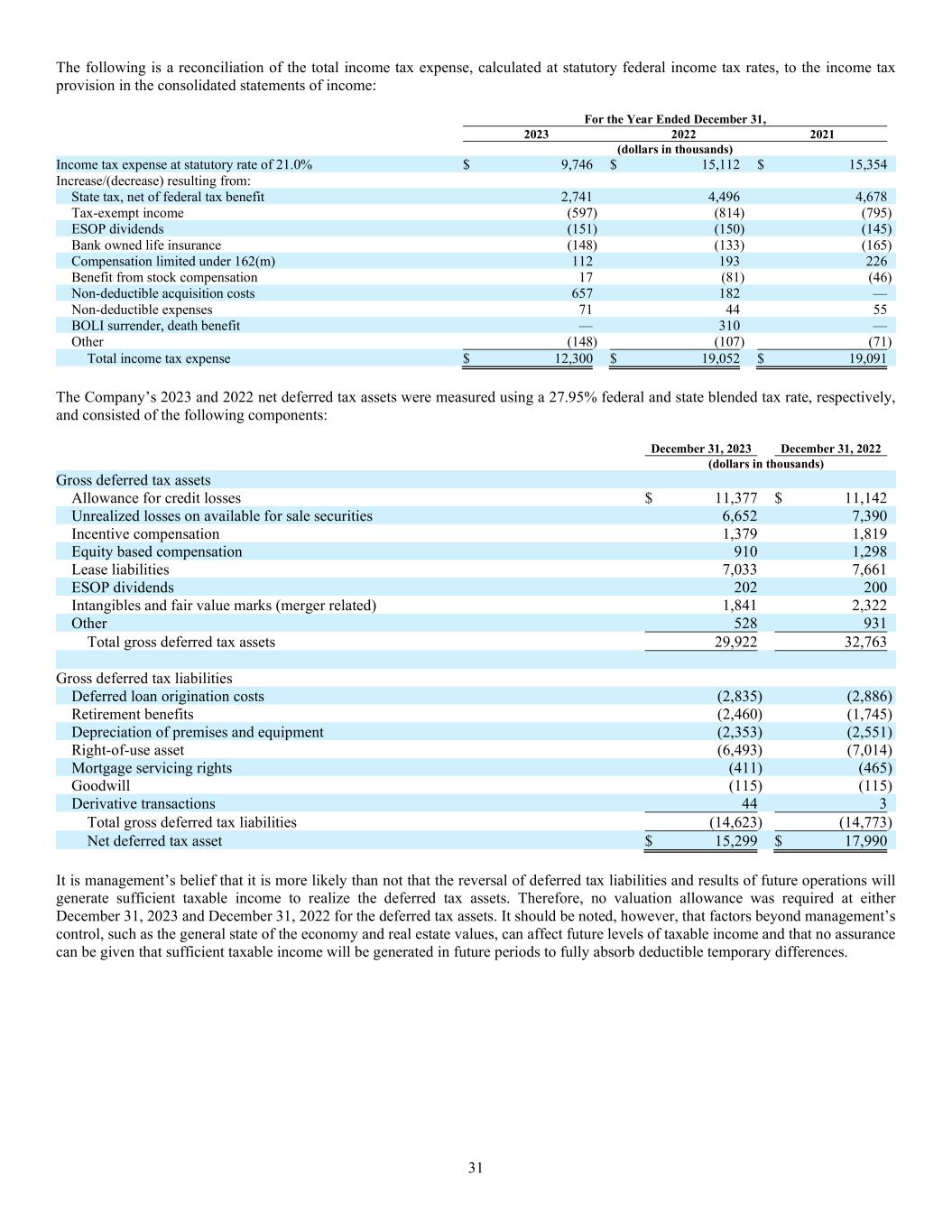 31 The following is a reconciliation of the total income tax expense, calculated at statutory federal income tax rates, to the income tax provision in the consolidated statements of income: For the Year Ended December 31, 2023 2022 2021 (dollars in thousands) Income tax expense at statutory rate of 21.0% $ 9,746 $ 15,112 $ 15,354 Increase/(decrease) resulting from: State tax, net of federal tax benefit 2,741 4,496 4,678 Tax-exempt income (597) (814) (795) ESOP dividends (151) (150) (145) Bank owned life insurance (148) (133) (165) Compensation limited under 162(m) 112 193 226 Benefit from stock compensation 17 (81) (46) Non-deductible acquisition costs 657 182 — Non-deductible expenses 71 44 55 BOLI surrender, death benefit — 310 — Other (148) (107) (71) Total income tax expense $ 12,300 $ 19,052 $ 19,091 The Company’s 2023 and 2022 net deferred tax assets were measured using a 27.95% federal and state blended tax rate, respectively, and consisted of the following components: December 31, 2023 December 31, 2022 (dollars in thousands) Gross deferred tax assets Allowance for credit losses $ 11,377 $ 11,142 Unrealized losses on available for sale securities 6,652 7,390 Incentive compensation 1,379 1,819 Equity based compensation 910 1,298 Lease liabilities 7,033 7,661 ESOP dividends 202 200 Intangibles and fair value marks (merger related) 1,841 2,322 Other 528 931 Total gross deferred tax assets 29,922 32,763 Gross deferred tax liabilities Deferred loan origination costs (2,835) (2,886) Retirement benefits (2,460) (1,745) Depreciation of premises and equipment (2,353) (2,551) Right-of-use asset (6,493) (7,014) Mortgage servicing rights (411) (465) Goodwill (115) (115) Derivative transactions 44 3 Total gross deferred tax liabilities (14,623) (14,773) Net deferred tax asset $ 15,299 $ 17,990 It is management’s belief that it is more likely than not that the reversal of deferred tax liabilities and results of future operations will generate sufficient taxable income to realize the deferred tax assets. Therefore, no valuation allowance was required at either December 31, 2023 and December 31, 2022 for the deferred tax assets. It should be noted, however, that factors beyond management’s control, such as the general state of the economy and real estate values, can affect future levels of taxable income and that no assurance can be given that sufficient taxable income will be generated in future periods to fully absorb deductible temporary differences.