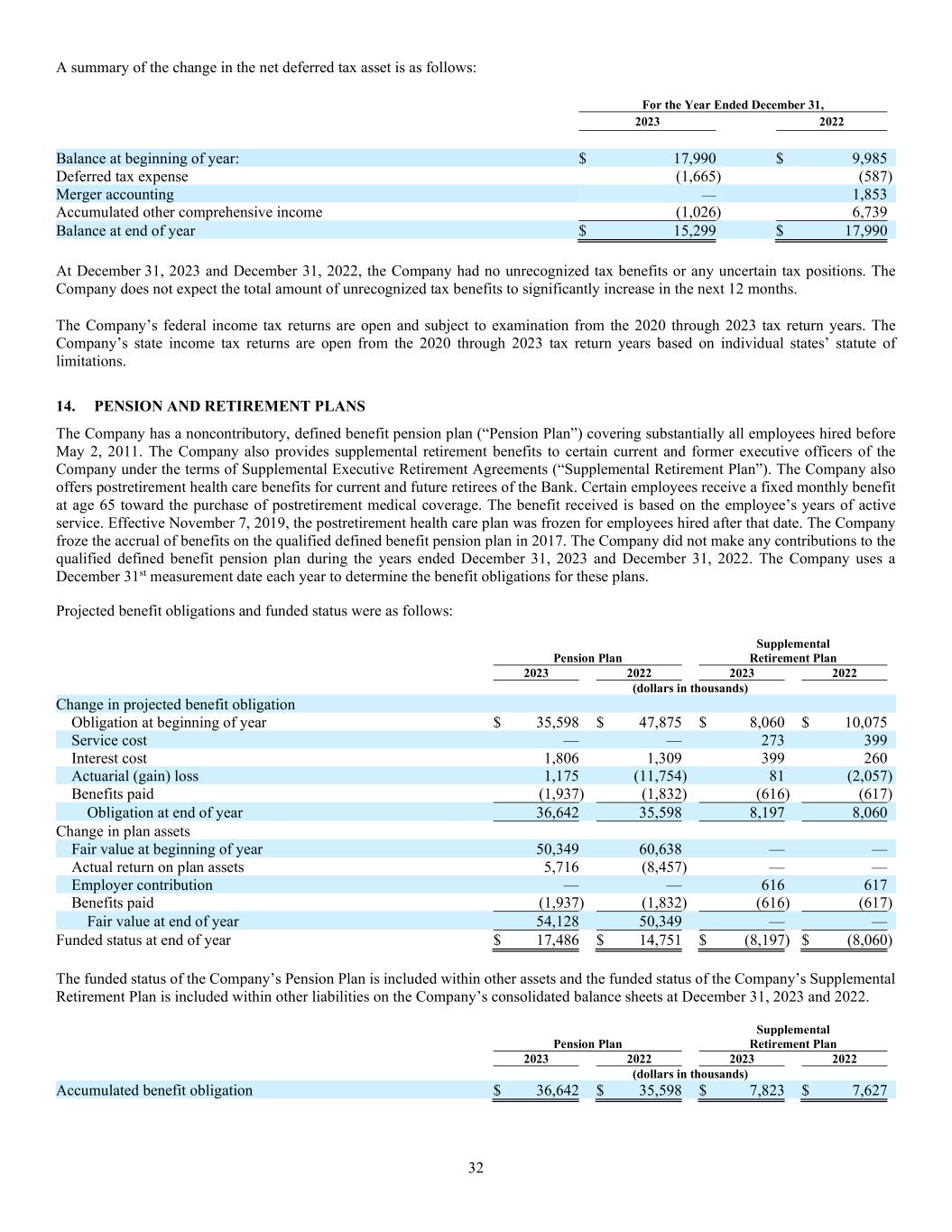 32 A summary of the change in the net deferred tax asset is as follows: For the Year Ended December 31, 2023 2022 Balance at beginning of year: $ 17,990 $ 9,985 Deferred tax expense (1,665) (587) Merger accounting — 1,853 Accumulated other comprehensive income (1,026) 6,739 Balance at end of year $ 15,299 $ 17,990 At December 31, 2023 and December 31, 2022, the Company had no unrecognized tax benefits or any uncertain tax positions. The Company does not expect the total amount of unrecognized tax benefits to significantly increase in the next 12 months. The Company’s federal income tax returns are open and subject to examination from the 2020 through 2023 tax return years. The Company’s state income tax returns are open from the 2020 through 2023 tax return years based on individual states’ statute of limitations. 14. PENSION AND RETIREMENT PLANS The Company has a noncontributory, defined benefit pension plan (“Pension Plan”) covering substantially all employees hired before May 2, 2011. The Company also provides supplemental retirement benefits to certain current and former executive officers of the Company under the terms of Supplemental Executive Retirement Agreements (“Supplemental Retirement Plan”). The Company also offers postretirement health care benefits for current and future retirees of the Bank. Certain employees receive a fixed monthly benefit at age 65 toward the purchase of postretirement medical coverage. The benefit received is based on the employee’s years of active service. Effective November 7, 2019, the postretirement health care plan was frozen for employees hired after that date. The Company froze the accrual of benefits on the qualified defined benefit pension plan in 2017. The Company did not make any contributions to the qualified defined benefit pension plan during the years ended December 31, 2023 and December 31, 2022. The Company uses a December 31st measurement date each year to determine the benefit obligations for these plans. Projected benefit obligations and funded status were as follows: Pension Plan Supplemental Retirement Plan 2023 2022 2023 2022 (dollars in thousands) Change in projected benefit obligation Obligation at beginning of year $ 35,598 $ 47,875 $ 8,060 $ 10,075 Service cost — — 273 399 Interest cost 1,806 1,309 399 260 Actuarial (gain) loss 1,175 (11,754) 81 (2,057) Benefits paid (1,937) (1,832) (616) (617) Obligation at end of year 36,642 35,598 8,197 8,060 Change in plan assets Fair value at beginning of year 50,349 60,638 — — Actual return on plan assets 5,716 (8,457) — — Employer contribution — — 616 617 Benefits paid (1,937) (1,832) (616) (617) Fair value at end of year 54,128 50,349 — — Funded status at end of year $ 17,486 $ 14,751 $ (8,197) $ (8,060) The funded status of the Company’s Pension Plan is included within other assets and the funded status of the Company’s Supplemental Retirement Plan is included within other liabilities on the Company’s consolidated balance sheets at December 31, 2023 and 2022. Pension Plan Supplemental Retirement Plan 2023 2022 2023 2022 (dollars in thousands) Accumulated benefit obligation $ 36,642 $ 35,598 $ 7,823 $ 7,627
