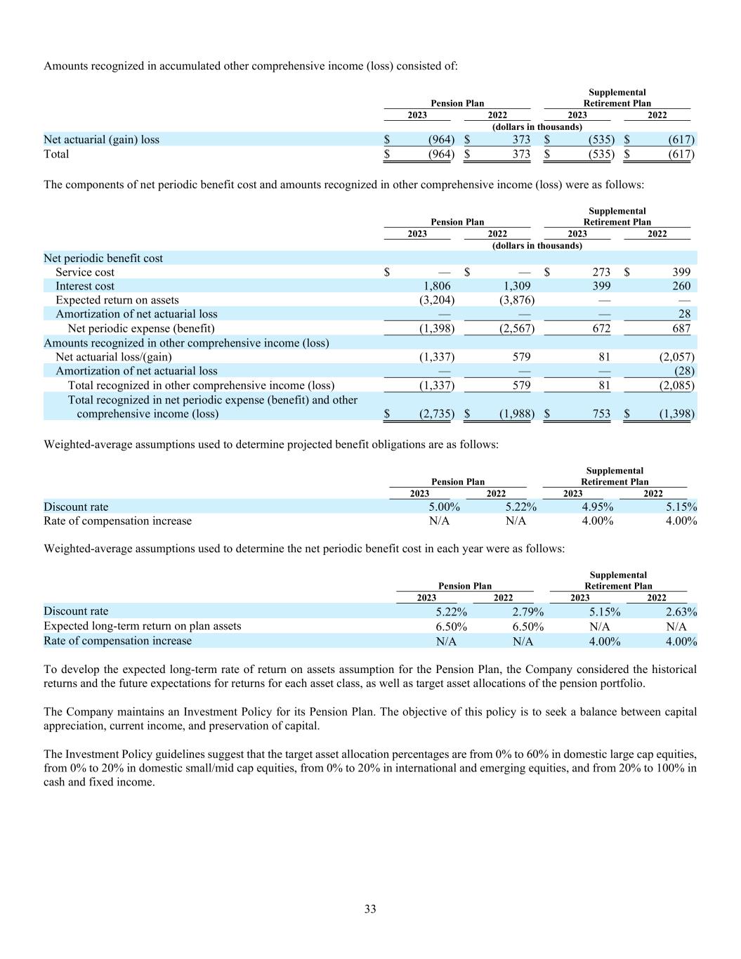 33 Amounts recognized in accumulated other comprehensive income (loss) consisted of: Pension Plan Supplemental Retirement Plan 2023 2022 2023 2022 (dollars in thousands) Net actuarial (gain) loss $ (964) $ 373 $ (535) $ (617) Total $ (964) $ 373 $ (535) $ (617) The components of net periodic benefit cost and amounts recognized in other comprehensive income (loss) were as follows: Pension Plan Supplemental Retirement Plan 2023 2022 2023 2022 (dollars in thousands) Net periodic benefit cost Service cost $ — $ — $ 273 $ 399 Interest cost 1,806 1,309 399 260 Expected return on assets (3,204) (3,876) — — Amortization of net actuarial loss — — — 28 Net periodic expense (benefit) (1,398) (2,567) 672 687 Amounts recognized in other comprehensive income (loss) Net actuarial loss/(gain) (1,337) 579 81 (2,057) Amortization of net actuarial loss — — — (28) Total recognized in other comprehensive income (loss) (1,337) 579 81 (2,085) Total recognized in net periodic expense (benefit) and other comprehensive income (loss) $ (2,735) $ (1,988) $ 753 $ (1,398) Weighted-average assumptions used to determine projected benefit obligations are as follows: Pension Plan Supplemental Retirement Plan 2023 2022 2023 2022 Discount rate 5.00% 5.22% 4.95% 5.15% Rate of compensation increase N/A N/A 4.00% 4.00% Weighted-average assumptions used to determine the net periodic benefit cost in each year were as follows: Pension Plan Supplemental Retirement Plan 2023 2022 2023 2022 Discount rate 5.22% 2.79% 5.15% 2.63% Expected long-term return on plan assets 6.50% 6.50% N/A N/A Rate of compensation increase N/A N/A 4.00% 4.00% To develop the expected long-term rate of return on assets assumption for the Pension Plan, the Company considered the historical returns and the future expectations for returns for each asset class, as well as target asset allocations of the pension portfolio. The Company maintains an Investment Policy for its Pension Plan. The objective of this policy is to seek a balance between capital appreciation, current income, and preservation of capital. The Investment Policy guidelines suggest that the target asset allocation percentages are from 0% to 60% in domestic large cap equities, from 0% to 20% in domestic small/mid cap equities, from 0% to 20% in international and emerging equities, and from 20% to 100% in cash and fixed income.